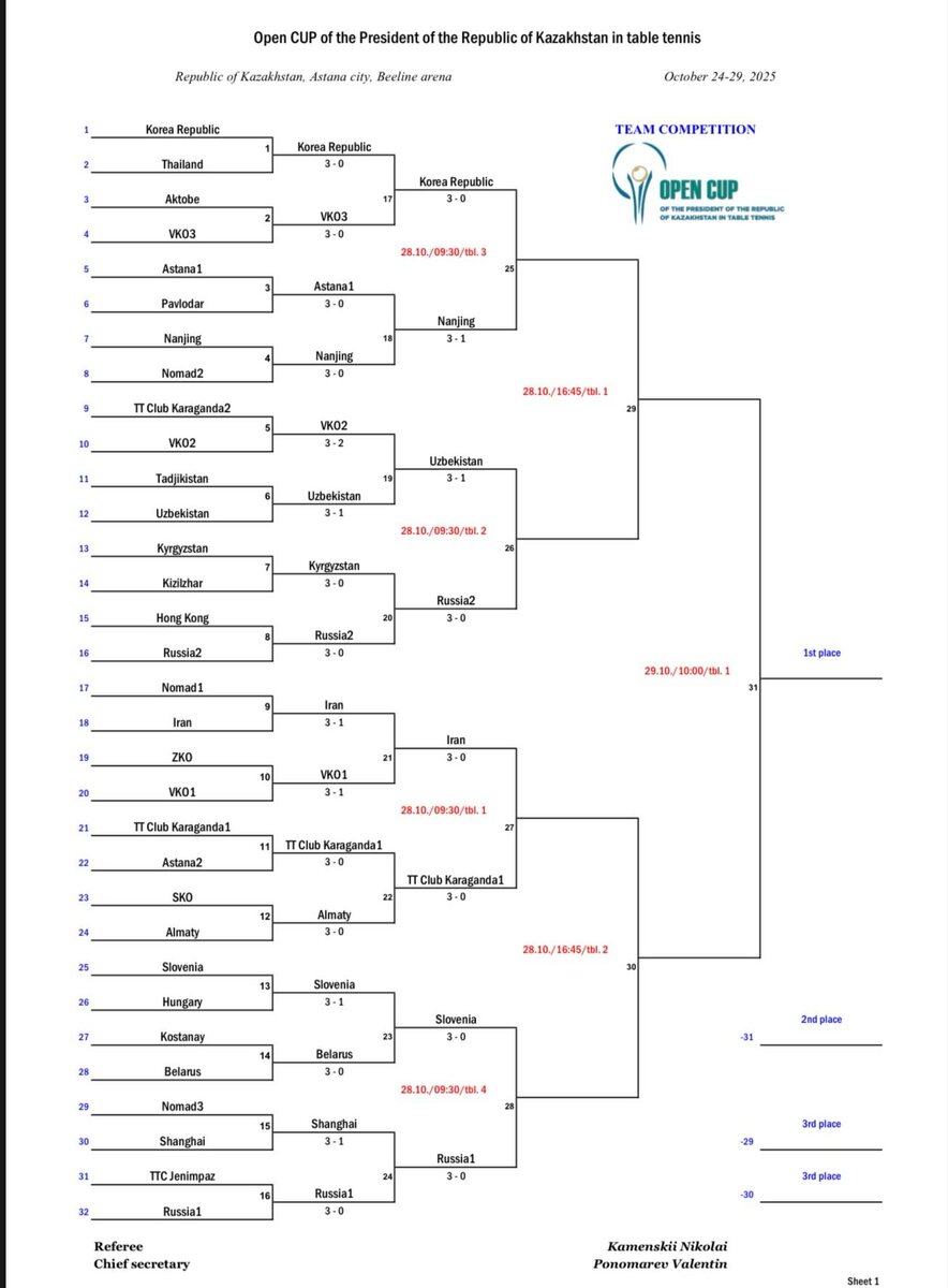 В ответ на пост 👁️ Результаты Кубка Президента Республики Казахстана за сегодня! Ждём жеребьевки сетки одиночек. У мужчин выходил один, у женщин двое. Завтра в 9:30 по местному четвертьфиналы команд. Россия-2 сыграет на втором транслируемом столе.