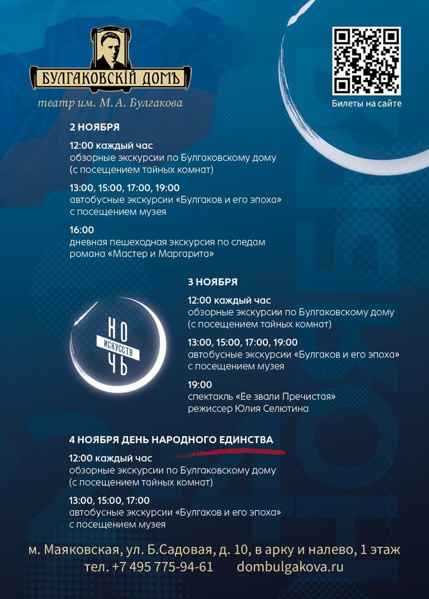 «Булгаковский дом» участвует в акции «Ночь искусств» 3 ноября в рамках акции «Ночь искусств» в нашем музее-театре «Булгаковский дом» можно бесплатно, но по регистрации, попасть на спектакль «Ее звали Пречистая» или на обзорные экскурсии «Трамвай 302-БИС. Булгаков и его эпоха». Регистрация на спектакль по ссылке: https://clck.ru/3PyUXS Регистрация на экскурсию по ссылке: https://clck.ru/3PyUBK 🌱 Спектакль «Ее звали Пречистая» создан по рассказу Наринэ Абгарян. Мальчик Назарос, бабушка Мамида, молчаливая женщина Зулали живут вместе. Каждому герою автор предоставляет слово – так, по кусочкам, складывается история этой странной троицы, вовлеченной в круговерть трагических событий. В финале обретает голос и Зулали и вполне поэтично, воздушно. Не удивительно, это ведь голос души… Дата и время: 3 ноября, 19:00 Продолжительность: 1 час 20 минут без антракта Место: музей-театр «Булгаковский дом», ул. Большая Садовая, 10 📸 Обзорная экскурсия «Трамвай 302-БИС. Булгаков и его эпоха» пер