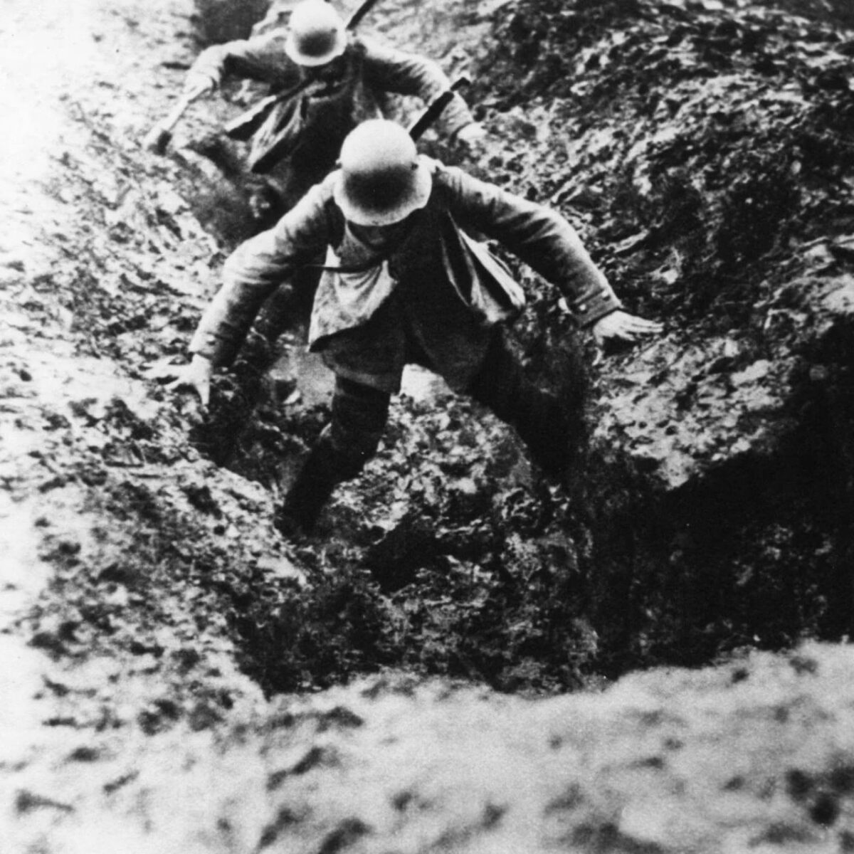 Немецкие солдаты проходят по грязной траншее во Фландрии, около 1917 года.
