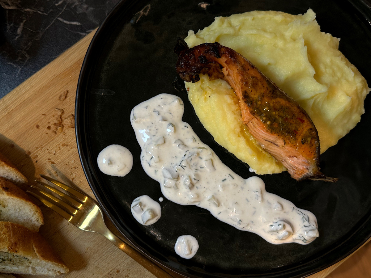Сегоня на ужин «Запеченная Семга» в аэрогриле с картофельным пюре и легким соусом тар-тар. Ранее уже писал про маринад к рыбе, который хотел воссоздать. Все получалось и время делиться рецептом. Сохраняем в заметки, чтобы не потерять 📝 Стейк из семки - 2 шт Соль/ перец - по вкусу Рыбная приправа с лимоном Соус «Сладкий Чили» СОУС ТАР-ТАР облегченная версия: Сметана - 1 столовая ложка Майонез - 3 столовые ложки Соль по вкусу Перец молотый по вкусу Сок четверти лимона Маринованные корнишоны - 2/3 шт Маринад огуречный -1 чайная ложка ДЛЯ ГАРНИРА ПОНАДОБИТСЯ: Картофель - 1,5 кг (картофель красный) Молоко - 1 стакан Сливочное мало - 25 гр Куриное яйцо - 2 шт Соль по вкусу Рыбу солим, перчим с двух сторон. Добавляем приправу для рыбы с лимоном, аналогично с двух сторон. А вот теперь самое главное! Для пикантности вкуса слегка поливаем стейки соусом «Сладкий Чили». Соус придаст сладковато-островатый вкус добавит красок рыбе. Заматываем пищевой пленкой или в пакет и убира