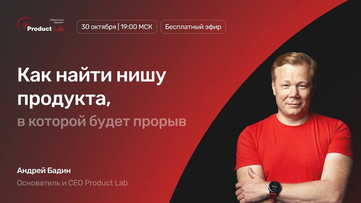 🔥Прямой эфир "Как найти нишу продукта, в которой будет прорыв" Всем привет! 30 октября в 19:00 по Мск Андрей Бадин, Основатель и CEO Product Lab, проведет прямой эфир, на котором обсудим, как определить нишу, в которой продукт сможет кратно расти, и почему правильная ниша — один из главных факторов успеха продукта. 📌 Что будет на эфире: — Почему никто не знает как искать нишу — Что такое ниша, как она связана с рынками, сегментами и форматами продукта — Как искать нишу по методологии Product Focus — Какие ошибки чаще всего мешают найти фокус 📌 Кому будет полезно: — Продакт-менеджерам и маркетологам — Руководителям направлений, владельцам бизнеса и стартап-командам — Всем, кто хочет найти прорывную нишу для своего продукта и бизнеса 📌 В результате эфира вы: — Разберетесь, как устроена ниша с точки зрения продукта и бизнеса — Узнайте, как перестать делать продукт “для всех” — Получите инструменты для поиска ниши, которая приведет к прорыву — Проведете базовую диагностику текущей