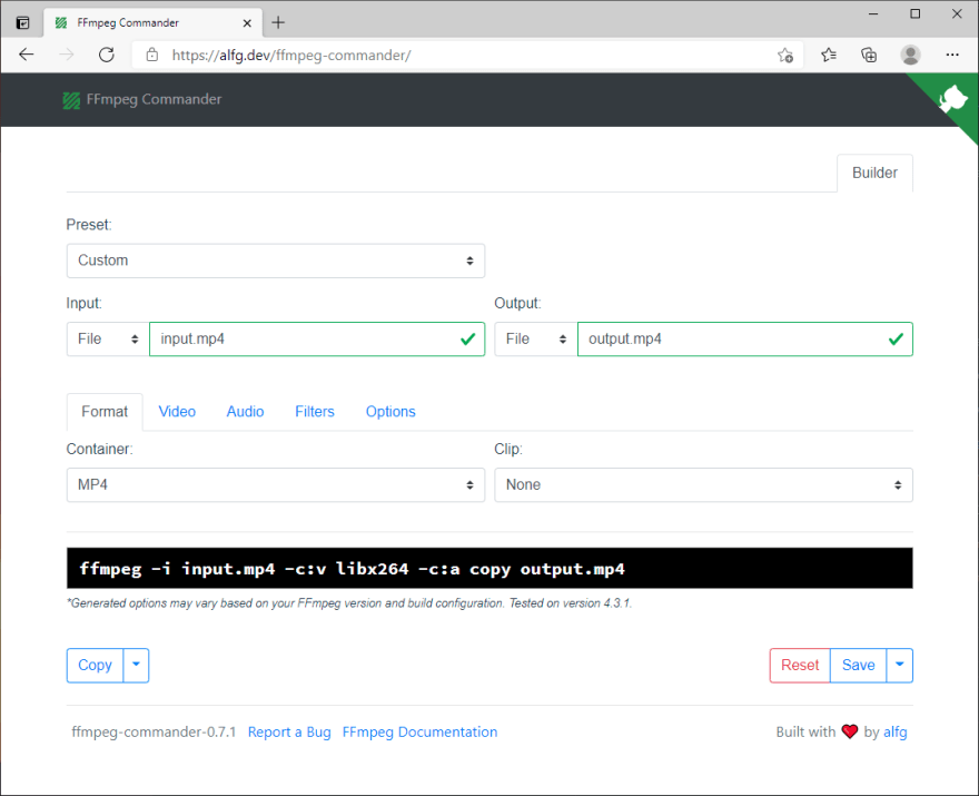 FFmpeg Commander — это веб-приложение с открытым исходным кодом, которое предоставляет удобный графический интерфейс для генерации команд FFmpeg. Оно предназначено для упрощения работы с популярным медиафреймворком и позволяет выполнять кодирование и обработку видео и аудио без запоминания сложных параметров командной строки. - Генерация команд: Визуальный подбор параметров для операций с видео и аудио, таких как выбор контейнера, кодека, настроек и фильтров. - Пресеты настроек: Включает примеры готовых пресетов для быстрого старта. - Сохранение и копирование: Сгенерированные команды можно скопировать в буфер обмена или сохранить в локальном хранилище браузера. - Открытый исходный код: Проект полностью открыт и размещен на GitHub Pages. Скачать с GitHub ⬇️Поддержать автора⬇️ ✅SBER: 2202 2050 7215 4401