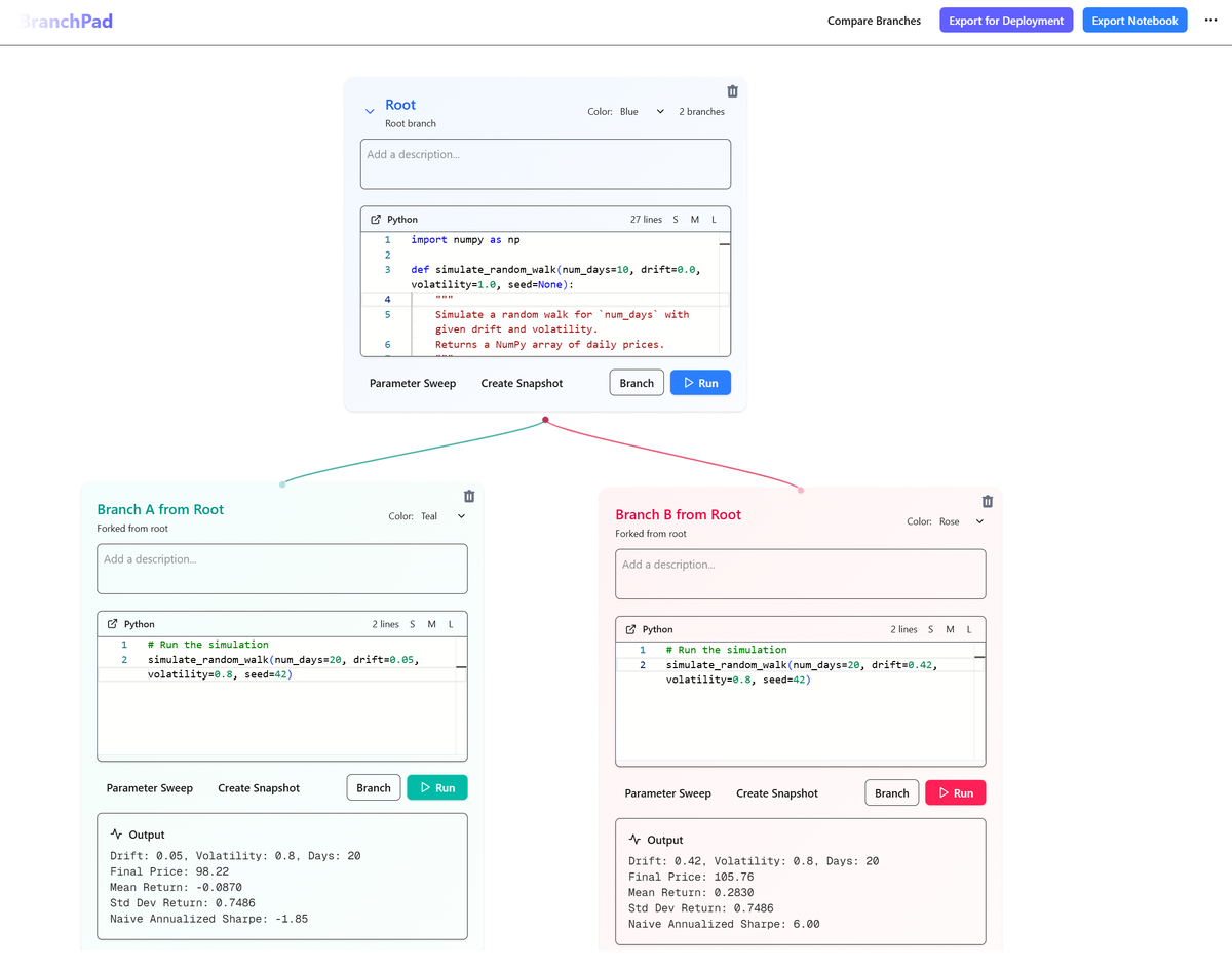 Branch-pad - это специализированная среда для работы с Jupyter-подобными блокнотами на Python, которая предоставляет возможности ветвления экспериментов аналогично системе контроля версий Git. Платформа предназначена для исследователей и разработчиков, работающих с машинным обучением, анализом данных и научными вычислениями. - Параллельное экспериментирование: Позволяет создавать несколько веток от исходного блокнота для тестирования различных гипотез и подходов. - Визуальное управление ветками: Интуитивный интерфейс для отслеживания и управления различными направлениями экспериментов. - Сохранение истории изменений: Автоматическое ведение истории всех модификаций и экспериментов в структурированном виде. - Интеграция с Jupyter: Совместимость с существующими экосистемами Python и Jupyter-ноутбуков. - Сравнение результатов: Встроенные инструменты для анализа и сравнения outcomes различных веток экспериментов. - Ускорение исследований: Возможность параллельного тестирования гипотез без п