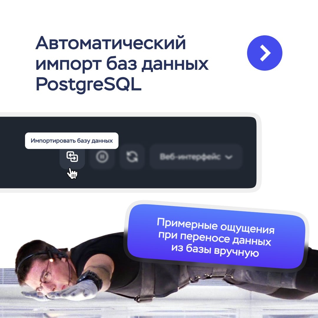 Эта миссия теперь выполнима — импортируем данные из PostgreSQL 💼 Из панели можно запустить автономный импорт данных из любой базы PostgreSQL (как с внешней, так и из нашего облака). Как переносить: перейти в нужную базу → кнопка ☝️ → ввести креды от базы-источника и выбрать владельца новой базы → done. 👉 Автоматически можно импортировать структуру таблиц, индексы и данные. А пользователей, роли и расширения нужно добавлять уже вручную. Рубрика вопросы: 1️⃣ Я могу перенести данные между разными версиями PostgreSQL? ➖ Да, но не получится перенести специфичные типы данных. 2️⃣ А могу выбрать уже существующую базу для импорта? ➖ Нет, новая база создается автоматически. Если в панели уже есть база с таким именем, то система выдаст ошибку. Импортировать базу в пару кликов →