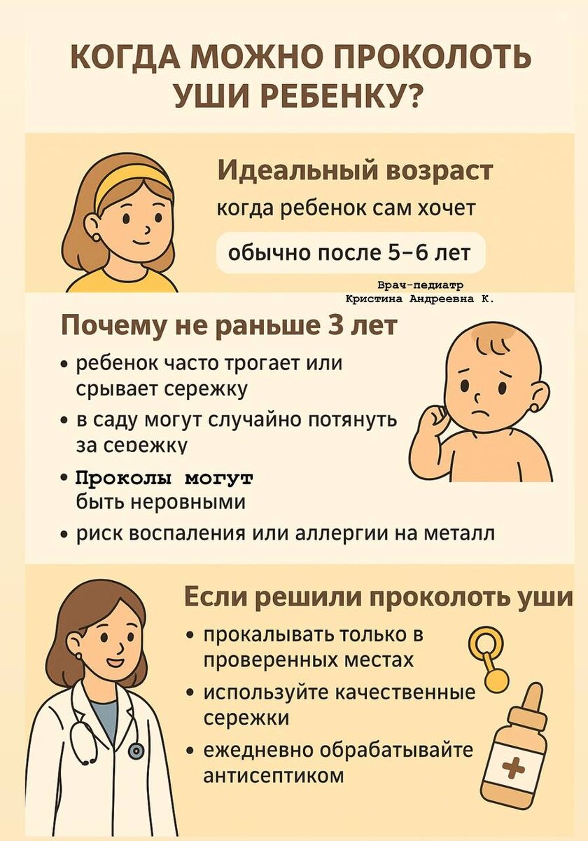 Когда можно прокалывать уши ребенку? Один из самых частых вопросов от родителей девочек 😊 ✨На мой взгляд, идеальный возраст — тогда, когда ребенок сам хочет. Обычно это происходит после 5–6 лет. В этом возрасте ребенок уже осознанно относится к процедуре, понимает, зачем это нужно, и способен ухаживать за проколами. ❗️Почему не рекомендую до 3 лет: ➡️Малыши часто трогают или срывают сережки — это риск травмы и инфицирования. ➡️В детском саду кто-то может случайно потянуть за сережку. ➡️У маленьких детей кожа и мочки ушей очень нежные — проколы могут получиться неровными, может начаться воспаление. ➡️Есть вероятность аллергии на металл (особенно, если использовались некачественные украшения). ⬇️Если вы решили проколоть уши: ✔️Делайте это только в проверенных местах: медицинском кабинете, клинике или у сертифицированного мастера. ☑️Используйте качественные сережки из чистого золота или серебра. ☑️После процедуры важно ежедневно обрабатывать проколы антисептиком, не трогать уши грязны