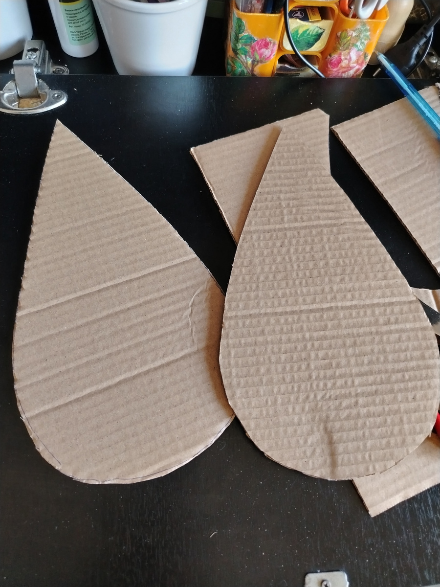 Решила попробовать сделать лесовичка. Взяла картон и вырезала вот такие заготовки. Затем взяла махровый фоамиран и вырезала листья. Рисовала произвольно, как получалось. Сначала раскроила материал, которым оклеила задник работы. Выравнивать ровно необязательно. Горячий клей всё хорошо приклеит. Девочки, кто хочет немного позаниматься декором, но не шьёт, необязательно покупать отрез в магазине тканей. На маркетплейсах за копейки вам пришлют любой набор лоскута. Хотя, если обратиться в швейное ателье, они с удовольствием вам отдадут лоскутки. Если конечно у них нет постоянных мастеров печворка, которым они эти лоскутки собирают. А в наборе от маркетплейса будет разное. И лоскутик флиса и кашкорсе и кожи и трикотажа. Короче будет из чего чего - нибудь поделать. У меня лоскутик чёрного трикотажа. На лицевой стороне разложила листья. Как я уже сказала, делала из того, что есть. А оранжевого не было. Поэтому листочки слегка "припорошила" жёлтой акриловый краской. Потом прикле