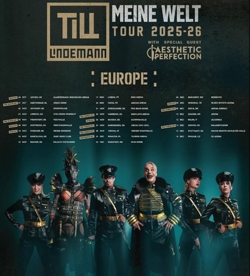 Сегодня вечером Тилль Линдеманн анонсировал тур "Meine Welt" своего сольного проекта на конец 2025 – начало 2026 гг. В его рамках группа Till Lindemann посетит 24 страны и проведёт 39 концертов! Также в туре в качестве специального гостя будет выступать американская электро – индастриальная группа Aesthetic Perfection. Согласно расписанию, тур группы Till Lindemann будет состоять из трёх частей. Сперва музыканты выступят в Европе (в Германии, Нидерландах, Испании, Англии, Австрии, Португалии, Франции, Польше, Венгрии, Румынии, Турции, Болгарии, Чехии, Италии и Швейцарии), затем в Азии (в Сингапуре, Тайланде, ОАЭ, Казахстане, Узбекистане и Грузии), а завершат тур пятью концертами в Австралии. Тур "Meine Welt" стартует уже 29 октября и завершится 22 января. Будут ли во время него вестись записи концертов в профессиональном качестве, неизвестно.