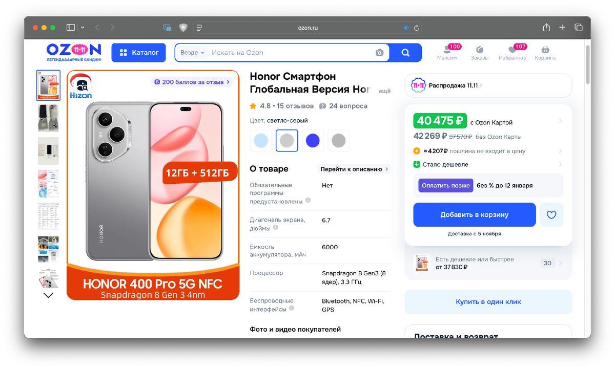 Зато корпус матовый и очень приятный на ощупь. HONOR 400 Pro ощущается добротно, с легким намеком на флагманский уровень. Особенно в сером цвете — на мой взгляд, он выглядит интереснее и солиднее, чем классический черный.