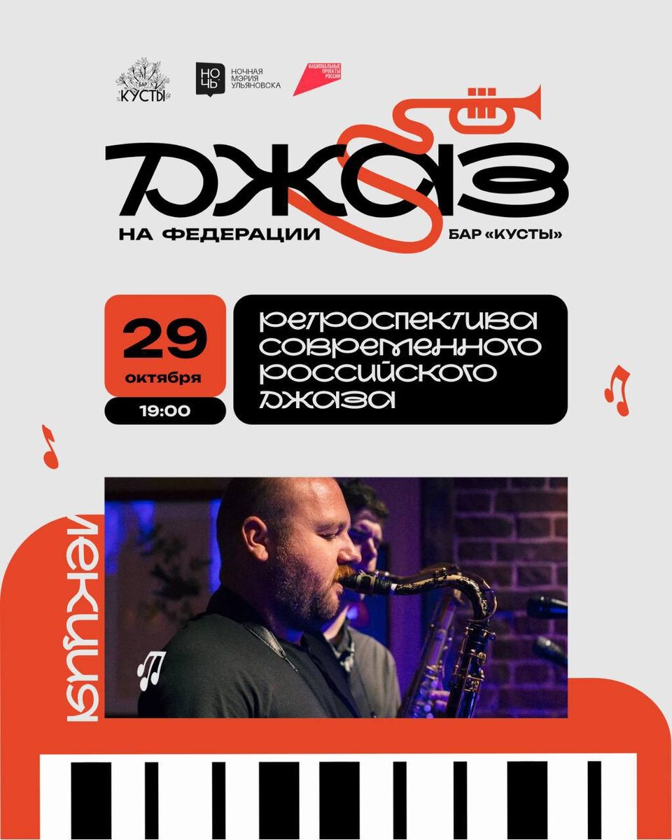 Лекция «Ретроспектива современного российского джаза»🎵 🗓️ 29 октября 19:00 📍Бар «Кусты» Погружаемся в звучание нового поколения джаза. На лекции: • узнаем историю самого современного российского джазового лейбла Rainy Days • послушаем передовых отечественных джазменов и их свежие релизы. Спикер — Александр Фирсов: мультиинструменталист, композитор и аранжировщик, преподаватель. В прошлом — участник коллективов Moscow Jazz Messengers, Brevis Brass Band, Академик Бенд, Симбирск Бенд. Руководитель джазового квартета Lush Life. 🏷️ Вход свободный, но по регистрации: https://ano-noch.timepad.ru/event/3645156/ #29октября25@culturnik