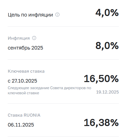 Продолжаю периодический обзор, посвященный государственным облигациям, индексируемым по инфляции, ОФЗ ИН. Предыдущие статьи: Текущие показатели денежно-кредитной политики: После снижения инфляции в первой половине текущего года с выходом на дефляцию в августе, рост цен, начиная с сентября опять начал увеличиваться: Инфляция по месяцам. В ноябре 2025 индексация стоимости облигаций будет отражать дефляцию за август 2025. В средине октября 2025 года НРД опубликовал на ноябрь номинальные цены по 4-м торгуемым выпускам ОФЗ ИН: 52002RMFS / ISIN RU000A0ZYZ26 52003RMFS / ISIN RU000A102069 52004RMFS / ISIN RU000A103MX5 52005RMFS / ISIN RU000A105XV1 В ноябре 2025 года месячная доходность по изменению номинала получается отрицательной -0,4001% или -4,80% годовых. С учетом купона и дисконта общая прогнозная годовая доходность по облигациям в ноябре 2025: ОФЗ 52002: 5,41% (на прошлый месяц была: 16,41%) ОФЗ 52003: 4,10% (на прошлый месяц была: 15,44%) ОФЗ 52004: 3,91% (на прошлый месяц была: 15,48