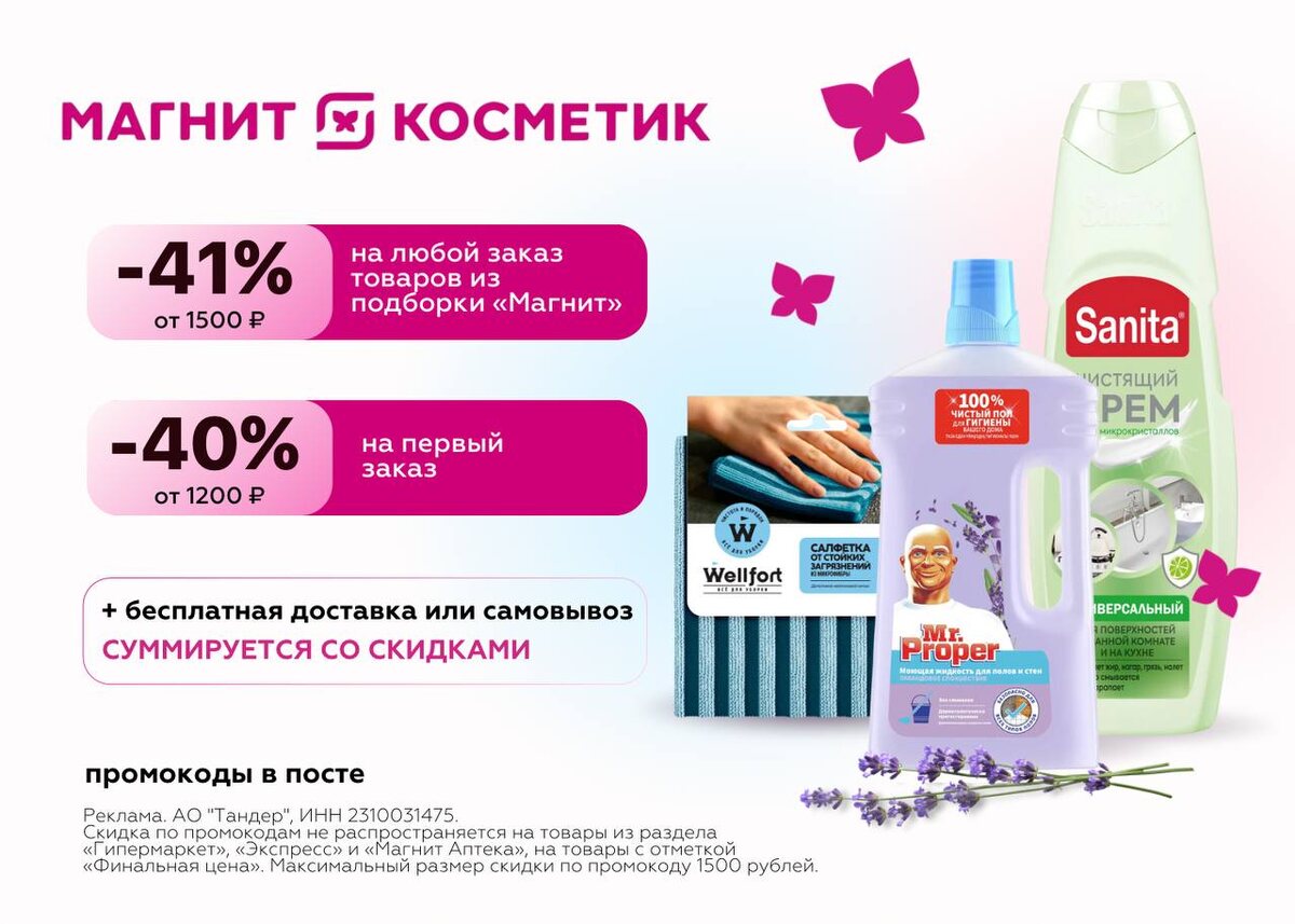 Магнит Косметик! 👉 1PKJX8NM Скидка 40% на первый заказ от 1200₽ 👉 КОФЕ Скидка 41% на любой заказ от 1500₽ на товары из подборки "Магнит". Промокоды суммируются со скидками, но не распространяются на товары из разделов «Гипермаркет», «Экспресс», «Аптека», с отметкой «Финальная цена». Максимальный размер скидки – 2000 ₽. Успевайте! Пока работают промокоды Реклама. АО «Тандер», ИНН: 2310031475