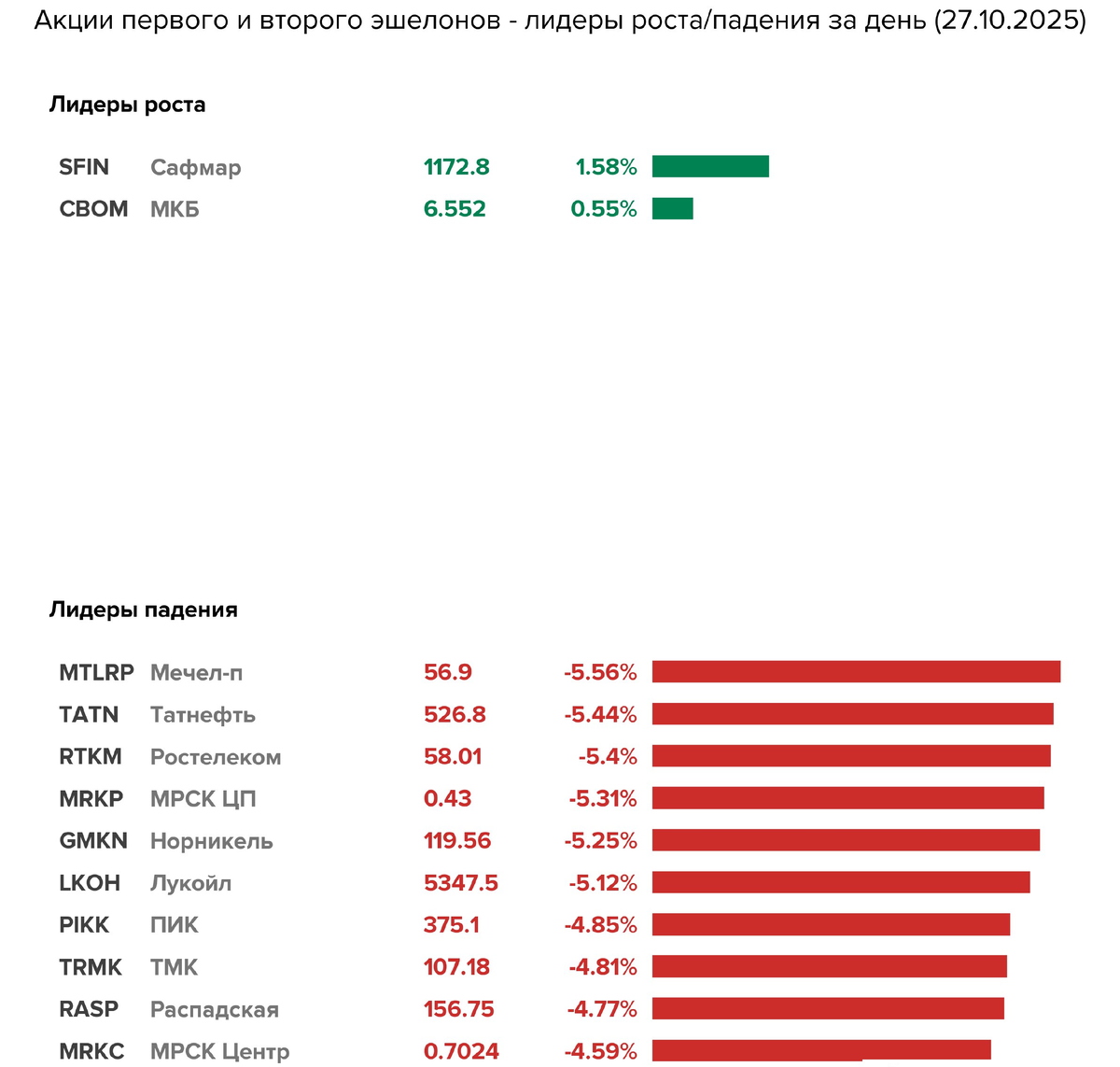 Всем привет! По итогам основной сессии 27 октября индекс Московской биржи потерял почти 3%: На фоне санкций на Лукойл и Роснефть начала падать валюта - есть идея, что эти экспортеры сейчас заведут валюту и обменяют на рубли. Нефть продолжает держаться выше 65 долларов за баррель Brent. Совет директоров СТГ ( КарМани) рекомендовал дивиденды за 9 мес 2025 г. в размере 0,08 руб/акция (ДД: 4,4%). Вот, что сообщает Банк России в пресс-релизе: — В сентябре цены в 41 из 85 российских регионов росли медленнее, чем