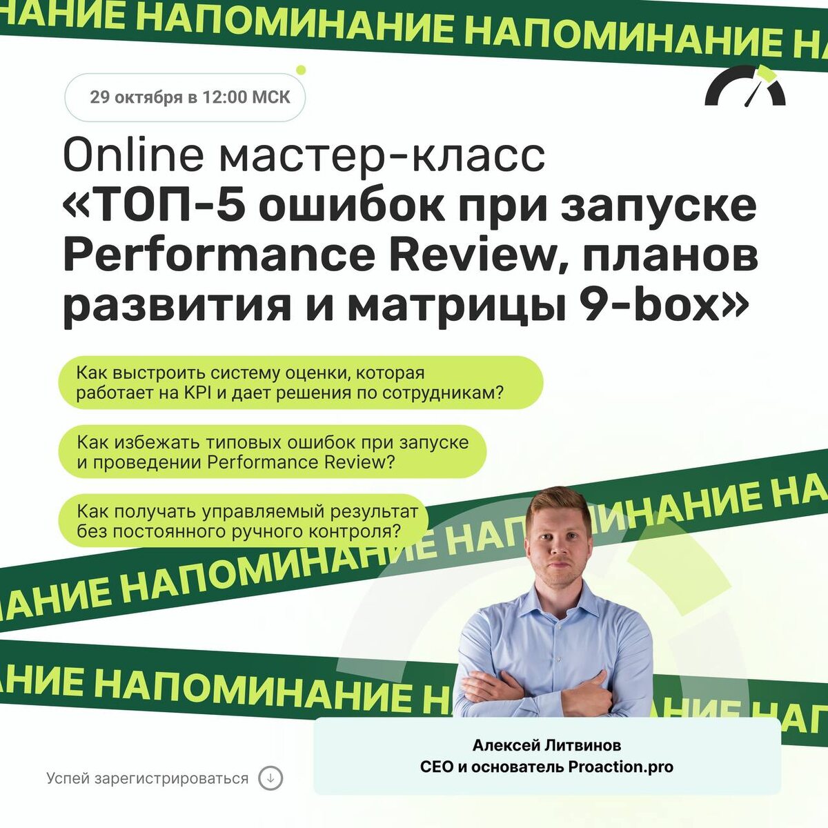 🗣Успейте зарегистрироваться! Бесплатный мастер-класс «ТОП-5 ошибок при запуске Performance Review, планов развития и матрицы 9-box» уже послезавтра! 📌 Save the date: 29 октября в 12:00 МСК Performance Review перестаёт приносить пользу, когда в нём нет управляемости и аналитики. На мастер-классе СЕО Proaction.pro Алексей Литвинов расскажет, как выстроить процесс, в котором всё под контролем: решения по KPI, грейдам и развитию принимаются на основе фактов. Что обсудим за 90 минут? ⏺ Что мешает компаниям связывать цели, оценку, развитие и KPI в единую систему? ⏺ Почему часто приходится собирать данные вручную, а реальной картины по командам не видно? ⏺ Как принимать решения о премиях, грейдах и повышениях на основе данных? 🎁 Всем, кто зарегистрируется, подарим гайд «Как за 5 шагов выстроить Performance Review, который реально работает». Успейте зарегистрироваться, чтобы разобраться, как сделать Performance Review понятным, управляемым и полезным для бизнеса. Количество мест огр