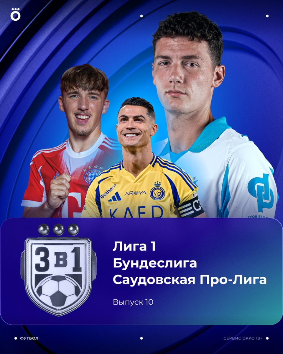 ⚡️ Через полчаса смотрим новый выпуск «Три в одном». Самые важные события Лиги 1, Бундеслиги и Саудовской Про-лиги в одной программе. «Монако» добыл первые три очка при Поконьоли, Роналду забил 950-й гол в карьере, а «Баварию» не остановить! Обсудим это и многое другое в 20:00. Включай в Okko, на YouTube или в VK Видео.