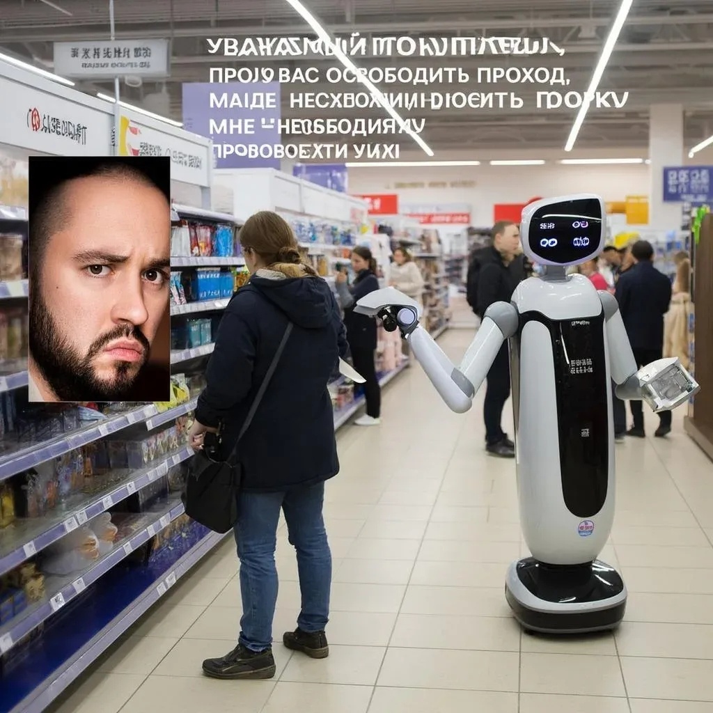 Городской торговый центр Вильнюса утопал в тихих ароматах свежей выпечки и нежных переливах музыки из динамиков. Люди плавно двигались среди стеллажей, лениво разглядывая товары и поглаживая взглядом яркие упаковки продуктов. Казалось бы, ничто не предвещало столкновения цивилизаций прямо здесь, посреди спокойствия бутербродов и салатов. Но вдруг тишину нарушило гудение моторчиков. Из-за угла выскочила серебристо-чёрная машина на колёсах, чьи блестящие сенсоры будто наблюдали за каждым движением покупателя. Это был китайский робот-помощник, закупленный магазином специально для поддержания порядка. Строгие линии корпуса отражали строгие требования современного ритейла: ни пылинки, ни лишнего звука, ни тени беспорядка. Робот приближался к мужчине средних лет, который стоял перед полками с сыром, задумчиво выбирая сырок копчёный, рассольный или мягкий творожный. Мужчина этот, Роберт Петраускас, выглядел типичным представителем местного населения — аккуратный, уверенный в себе, слегка н