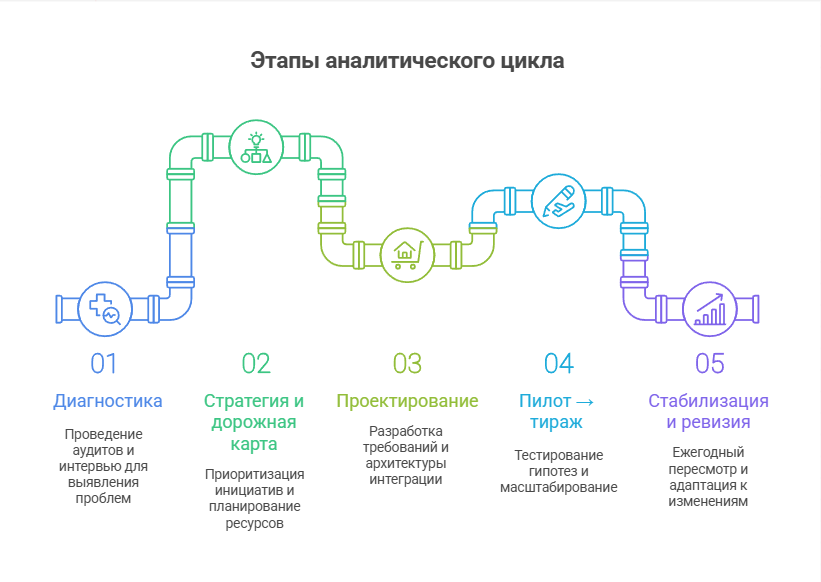 Компании, имеющие глубокую отраслевую экспертизу, могут опираться на библиотеку типовых решений и лучших практик. Но типовое — это отправная точка, а не готовый ответ. Каждая компания уникальна своей стратегией, корпоративной культурой, унаследованными системами. Аналитика адаптирует лучшие практики под конкретный контекст.