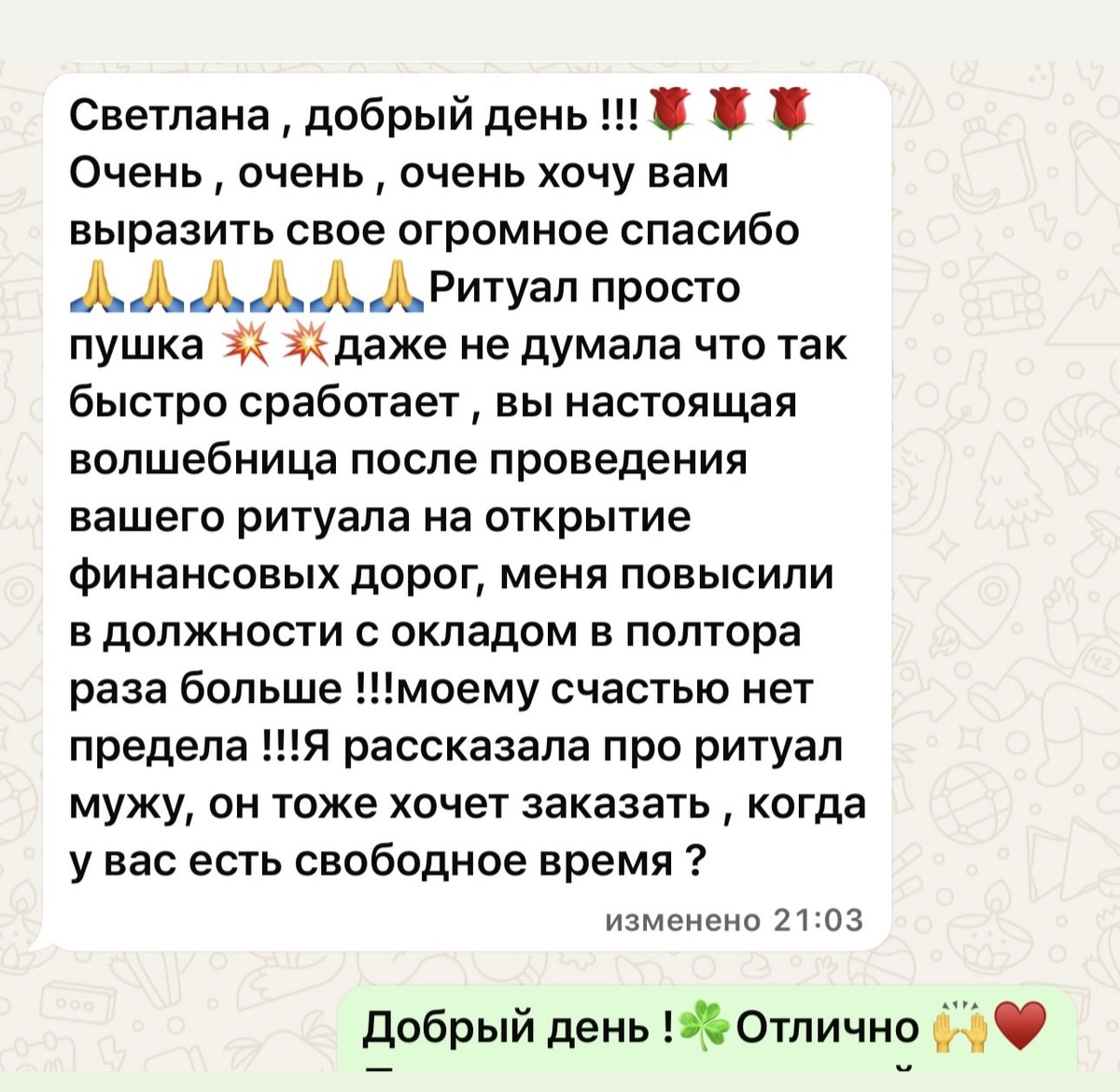 Дорогие мои светлые души!✨Я хочу сказать вам самое искреннее спасибо. 🙏🏻 Каждый ваш отзыв, каждая частичка обратной связи — это не просто слова. Это живая энергия, которая наполняет мое дело смыслом и вдохновляет помогать вам снова и снова.🙏🏻♥️ Вы доверяете мне самое сокровенное — свои вопросы, тревоги и надежды. И видя, как мои расклады помогают вам обрести ясность, сделать шаг или просто успокоить сердце, я понимаю, что мы с вами создаем нечто большее. Я верю всем сердцем, что эта искренняя энергия благодарности и доверия, которую мы создаем вместе, вернется в вашу жизнь стократно. 🙏🏻☝️♥️Пусть в нее придет еще больше света, любви, ясности и всех мыслимых благ. 🙏🏻🙏🏻Вы этого достойны.☝️☝️☝️♥️ С любовью и благодарностью, ваш таролог Светлана.✨✨✨