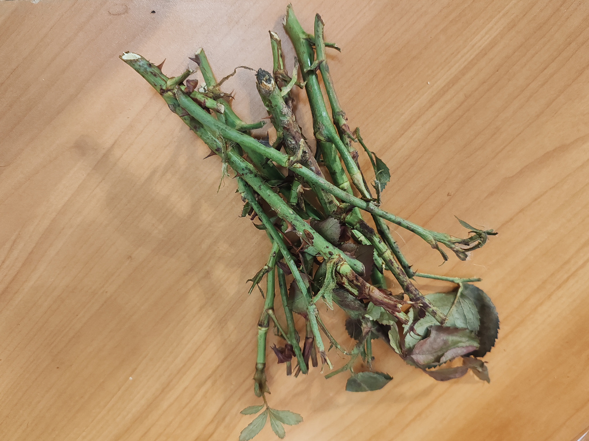 Взял розы, которые были черенкованы неделю назад и пролежали на земле всё это время. Хочу посмотреть смогут ли черенки дать корни. Первое что я сделал это опустил, каждый черенок в фитоклон (средство для укоренения), а потом налил в стакан немного фильтрованной воды и поставил туда все черенки, а также чуть обрызгал их из пульверизатора с водой разведённой чуть марганцовкой для обезараживания черенков. Буду ждать 2-4 недели, а потом поделюсь результатами. А как Вы думаете смогут ли они выжить?
