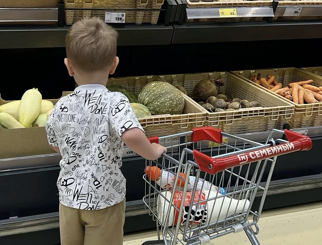Федя, увидев папу, обрадовался и гордо показал на тележку: это он сам собрал им продуктов на неделю, а то и на месяц.