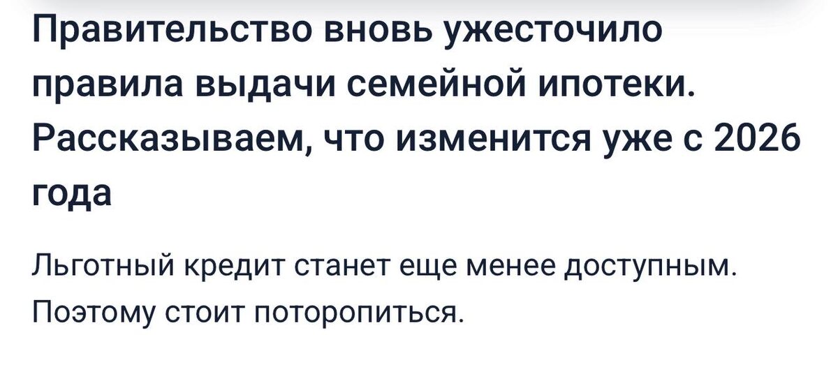 ⚡️⚡️⚡️Друзья, важные новости! С 1 февраля 2026 года вступают в силу новые правила семейной ипотеки — и поверьте, это серьёзно меняет правила игры. Теперь супруги обязательно будут выступать созаемщиками, а донорская схема и возможность получить льготную ипотеку повторно одной семьёй уходят в прошлое. Проще говоря — если вы сейчас не оформили семейную ипотеку, то в ближайшие три месяца рискуете упустить шанс воспользоваться самой доступной сейчас программой жилья по выгодной ставке 6%! Да, это действительно последний звонок для тех, кто планировал купить не одну, а пару квартир по льготной ставке! После 1 февраля 2026г. такой возможности больше не будет⚡️ А также планируется изменение ставки в зависимости от количества детей: -1 ребенок до 6 лет включительно в семье - ставка 12%; - двое детей 6% -трое детей -4%. Вывод: Окно возможностей сильно сужается. Раздумья и откладывание решения сейчас обернутся потерей реального варианта купить недвижимость за дешевые деньги себе и сэкономить