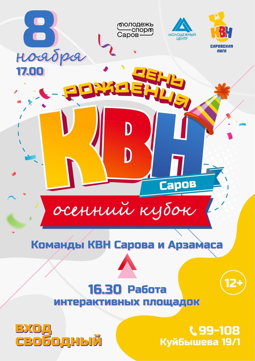 Молодежный центр приглашает горожан отметить День рождения КВН 8 ноября на сцене выступят самые веселые и находчивые юмористы из Сарова и Арзамаса. Также для гостей будут организованы интерактивные площадки. Начало в 16:30. Вход свободный.