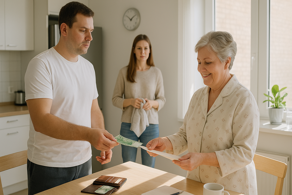 Муж вернулся на кухню и протянул деньги матери. Галина Ивановна взяла купюры, пересчитала пальцем и кивнула.