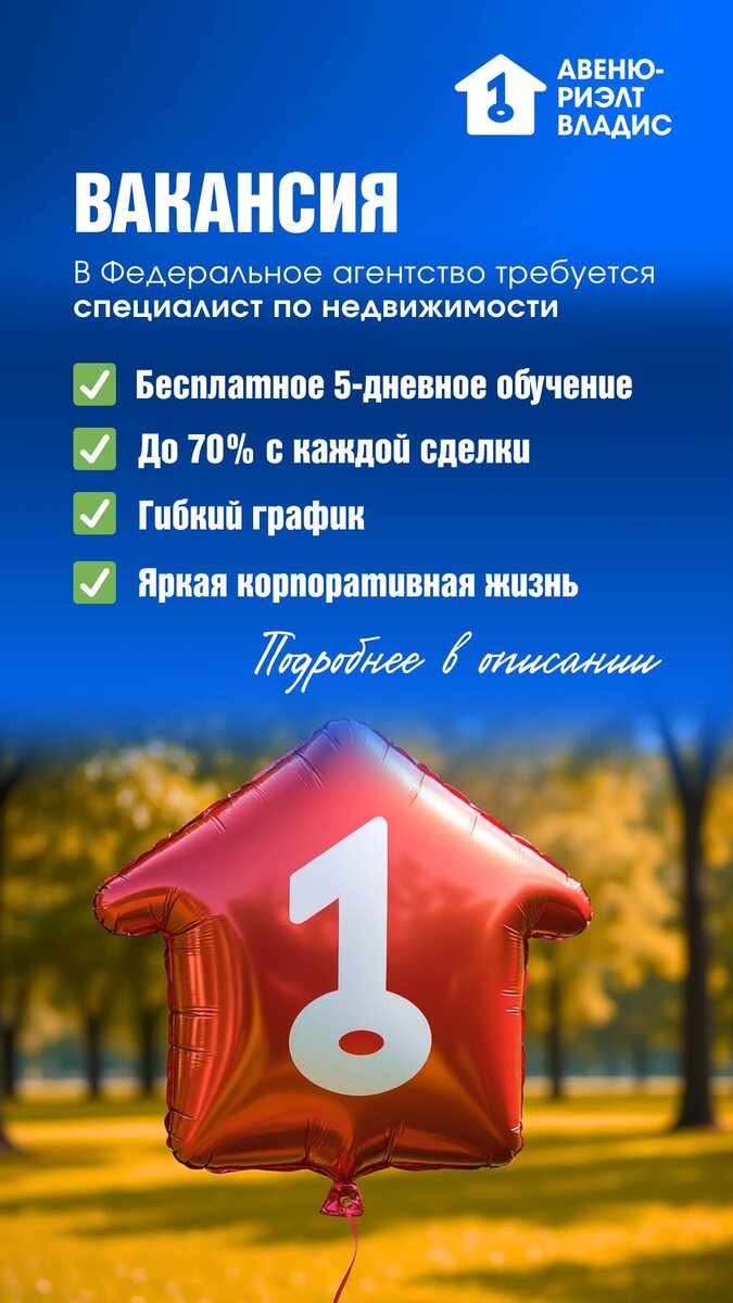 Приглашаю присоединиться к дружной команде агентства недвижимости «Авеню-Риэлт Владис» 😉 Опыт не важен, важно желание! Компания гарантирует бесплатное обучение, введение в профессию с наставниками и комиссии со сделок до 70%. У нас можно расти и развиваться как личность и как профессионал! А также попробовать себя в одной из самых высокооплачиваемых профессий России 🔥 Оставляйте заявку на сайте https://mrqz.me/rabotaavenu или звоните 📲 8(911)460-84-51 Подробнее о вакансии: https://hh.ru/vacancy/108672249