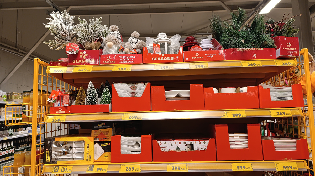 Приветствую вас, мои дорогие друзья и подписчики. В Пятёрочке покажу витрину с новогодними украшениями и красивой посудой с новогодним оформлением. Магазин находится по адресу Ростовская область, Зерноградский район, станица Мечетинская, улица Ленина, 122 Ветка Seasons Гроздь декоративная новогодняя цена 269.99 рублей. Цена в каталоге указана уже со скидкой 199.99 руб. Обзор снимала 27 октября, и уже ценники не соответствуют, изменилась цена.Стала немного ниже. Ель Seasons искусственная в мешке цена 549.99 рублей. Цена в каталоге со скидкой 399.99 руб. Статуэтка Seasons Санта с подсветкой 19 см цена 799.99 рублей. Цена в каталоге со скидкой 599.99 рублей. Фонарь светодиодный Seasons ,состав полимерный материал, металл , LED-элемент. Страна Китай. Цена 799.99 рублей. Цена в каталоге со скидкой 599.99 рублей. Ветка рождественская декоративная цена в каталоге со скидкой 199.99 руб. Тарелка стекло 20 см цена со скидкой по карте 199.99 рублей. Кружка 340 мл фарфор цена 399.99