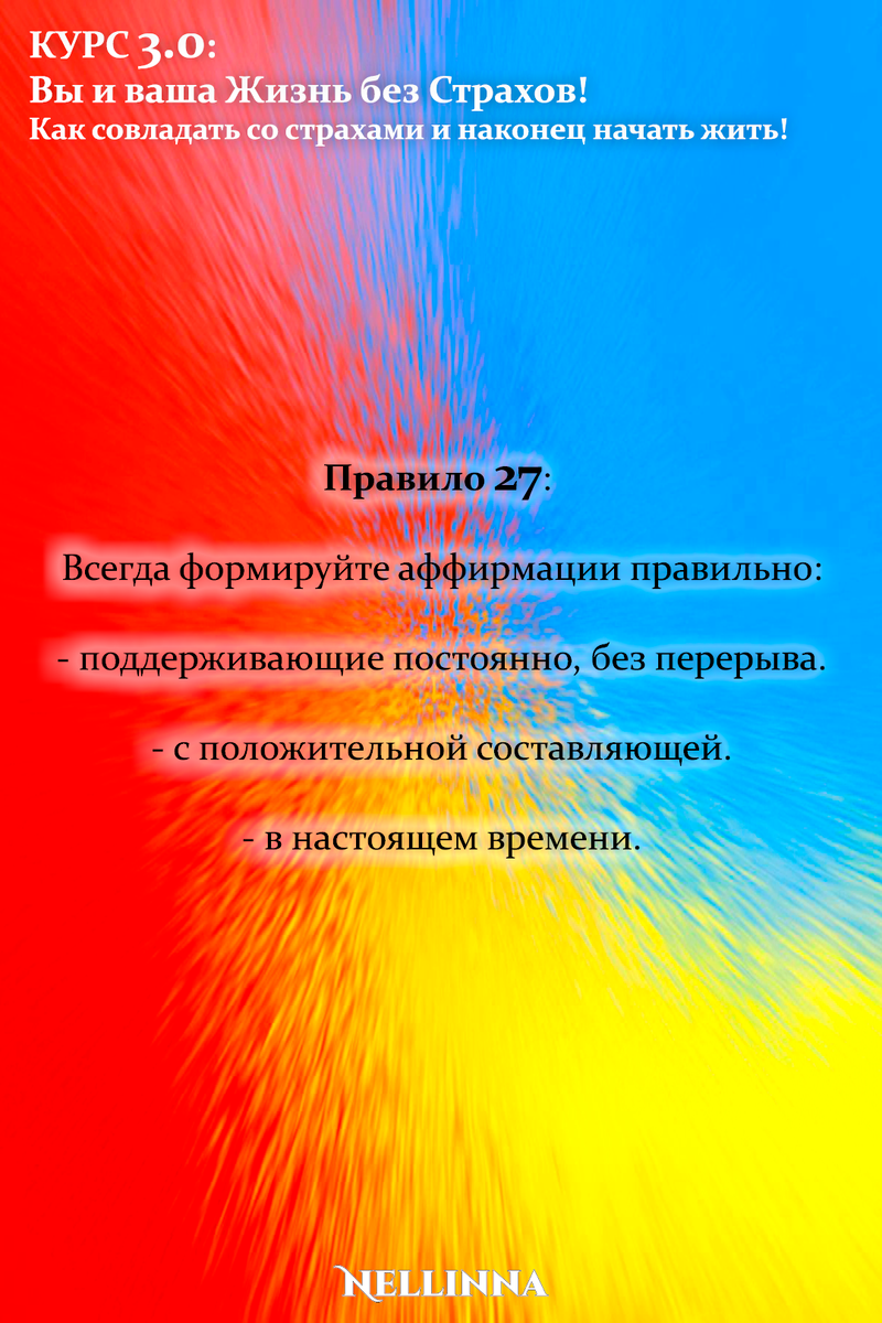 Продолжение - Принцип 27: Меняется ситуация или настроение, и вы меняете аффирмацию на ту, которая способна поддержать вас в данный момент. С этой минуты позитивное мышление станет для вас более привычным, так что даже несколько напоминаний в течение дня будет достаточно, чтобы сохранять приподнятое настроение. Чтобы не пропустить следующую публикацию – Подписывайтесь! И делитесь полезной и бесплатной информацией! #курс #тренинг #обучение #практикум