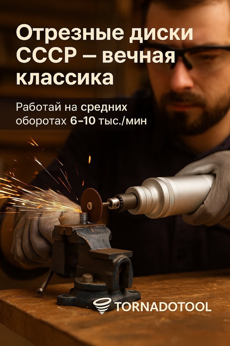 Отрезные диски СССР — вечная классика Почему их любят мастера •Жёсткие, тонкий пропил, предсказуемая линия. •Режут сталь, латунь, алюминий, винты/гвозди, тонкие профили. •Хорошо держат форму, не «плывут» при аккуратной подаче. Как работать правильно •Средние обороты (~6–10 тыс./мин), короткие проходы. •Короткий вылет, диск строго соосно в патроне 0,5–6,5 мм. •Вести диском, не давить — пусть режет абразив. •Очки + респиратор обязательны; заготовку жёстко фиксировать. Лайфхак Tornadotool •С нашим патроном 0,5–6,5 мм ставишь и советские диски, и современные — без смены цанг. •Мощная тяга на низких оборотах помогает резать аккуратно и без перегрева.