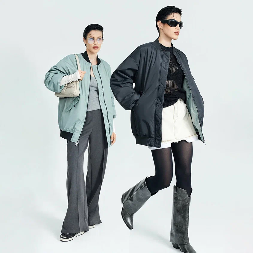 - Укороченные бомберы из вельвета и рельефной резины: В тренде 90-е, но переосмысленные. Вельвет придает ностальгичности, а вставки из текстурной, почти тактильной резины добавляют футуристичности и защищают от непогоды.