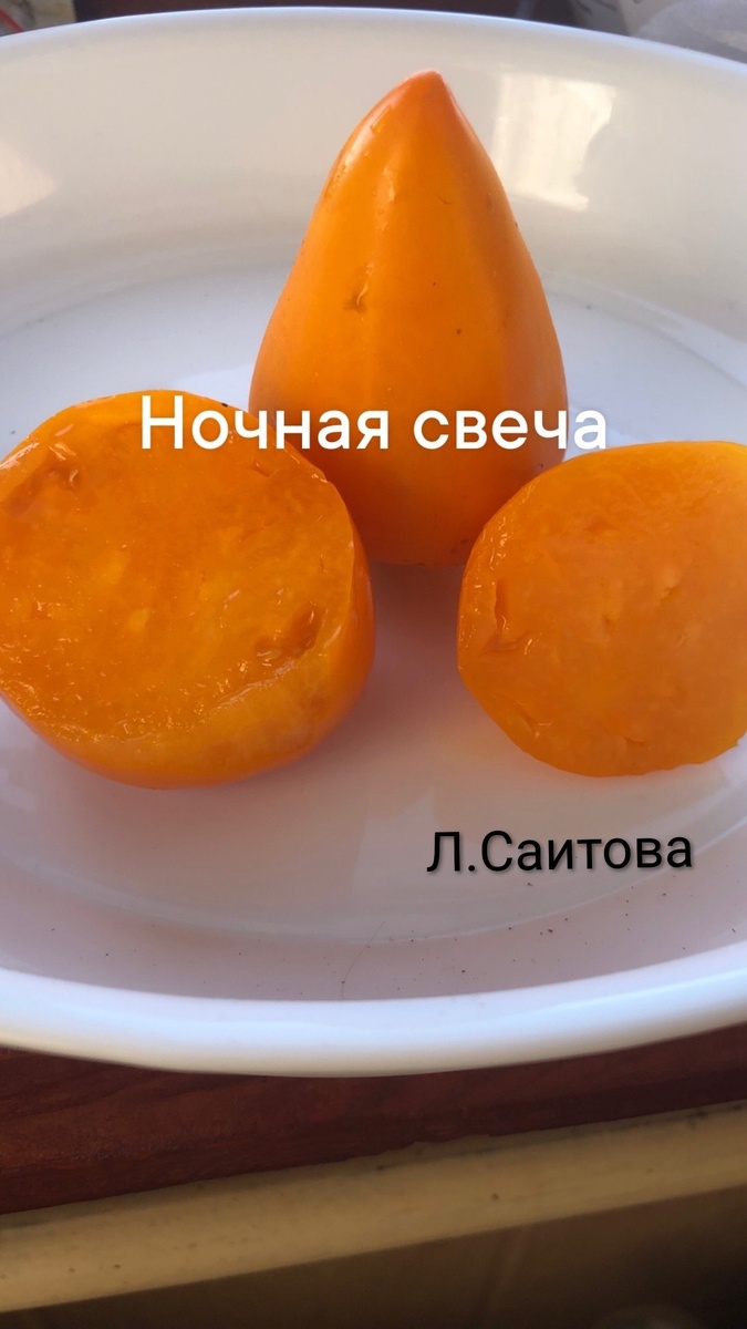 Ночная свеча.Индет,один из самых вкусных и высокоурожайных желтоплодных сортов среднего срока созревания. Плоды насыщенного цвета, ближе к ярко-оранжевому, имеют идеальную сердцевидную форму иногда с вытянутым носиком. Мякоть плотная, мясистая, ароматная, умеренной сладости, практически без семян