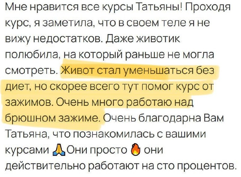 На днях закончился курс «SOS-активаторы чувственности и самооценки». Участницы пишут отзывы и часто девушки идут ко мне не на 1 курс, а проходят сразу несколько. Так и Елена: проходила «Мышечные зажимы» и вот результаты - живот уходит. Не видит недостатков в теле. Даже животик полюбила, а раньше смотреть на него не могла.