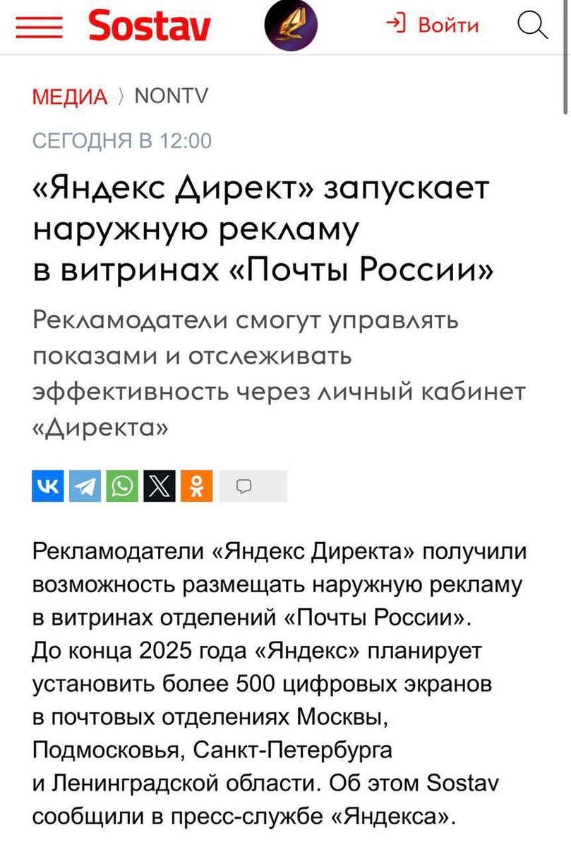😄🔥Почта России эффектно вкатилась в XXI век. Яндекс.Директ запустил новый формат — цифровые экраны в отделениях Почты России. До конца года таких будет 500+ в Москве, Петербурге и регионах. Можно выбрать район, время, частоту показов и даже смотреть аналитику прямо в интерфейсе. По сути, офлайн наконец научился вести себя как интернет. Ирония в том, что сделала это не модная стартап-агенция, а старая добрая Почта, у которой конверты ещё пахнут детством и очередями. Я всё время удивляюсь, как вместе находятся макароны, ящики для посылок и валерьянка в витрине)) А на что засматриваетесь на почте? 😁👇 *Связаться со мной
