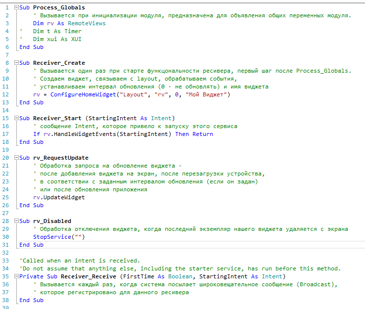 Ниже — описание создания виджета, который не делает вообще ничего, а только отображается на рабочем столе телефона. Для разработки виджета в B4A можно использовать проект «по умолчанию» — это стандартный тип минимального Android-приложения. После создания проекта заходим в меню «Конструктор» и проектируем внешний вид виджета. В самом простейшем случае добавляем на холст Activity элемент «Panel» (панель должна быть обязательно, как родительский элемент для всего остального), а на него — элемент «Label» (поле надписи). Иерархия визуальных элементов в Конструкторе должна быть примерно следующей: Activity => Panel1=> Label1. В свойстве «Text» элемента «Label» можно сразу написать «Привет, widget!». В окне «Modules» в IDE добавляем новый модуль через контекстное меню «Добавить новый модуль» - «Receiver Module» (это модуль определённого типа, который нам сейчас и нужен). Код модуля будет примерно следующим. Sub Process_Globals ' Вызывается при инициализации модуля, предназначена для объявлен