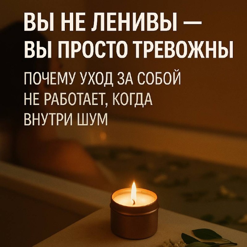 «Вы не ленивы — вы просто тревожны. Почему уход за собой не работает, когда внутри шум» Когда тревога нарастает, кажется, что нужно “взять себя в руки”: устроить спа-день, записаться на массаж, купить свечу, заняться йогой. Но часто это не помогает. Через пару часов — всё то же ощущение внутреннего шума и опустошения. Дело не в уходе. Дело в том, что тревожный мозг не умеет отдыхать, пока не почувствует безопасность. Почему “уход за собой” не всегда работает Когда вы в тревоге, тело остаётся в режиме “бей или беги”. Даже маска на лице и ванна с солью не воспринимаются как отдых — потому что глубоко внутри мозг занят выживанием. Вы можете лежать в тёплой ванне, но внутри идёт диалог: — “Завтра важная встреча…” — “А вдруг я делаю недостаточно?” — “Почему я не могу просто расслабиться?” Вот почему после “само-ухода” иногда становится даже хуже: мы добавляем себе вины за то, что не смогли почувствовать эффект. Что помогает по-настоящему 1. Не уход, а контакт. Не пытайтесь «успокоит