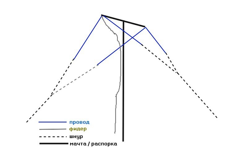 2-элементная проволочная антенна Yagi 🔹 Эта антенна Yagi обеспечивает усиление около 3 дБ по сравнению с горизонтальным диполем при той же высоте центра. Концы тросов расположены под углом друг к другу, что позволяет соединить их в общей точке (используя примерно четверть длины троса на каждом конце), а затем протянуть один трос от неё к точке крепления. 🔹 Это уменьшает количество тросов, которые нужно развязывать для вращения антенны, если она подвешена на распорке на мачте. При желании элементы можно закрепить прямо. Укорачивание рефлектора увеличивает коэффициент усиления. Читать далее >>