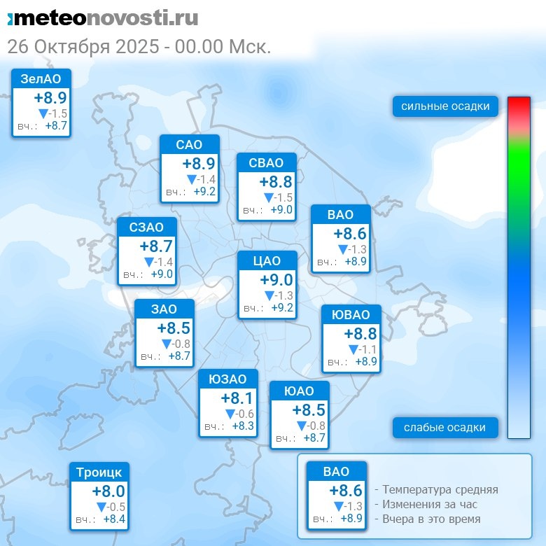 В 0:00 в Москве было от +7.8°C до +9.2°C, средняя температура +8.7°C #погода #Москва #осень #температура #26октября #воскресенье