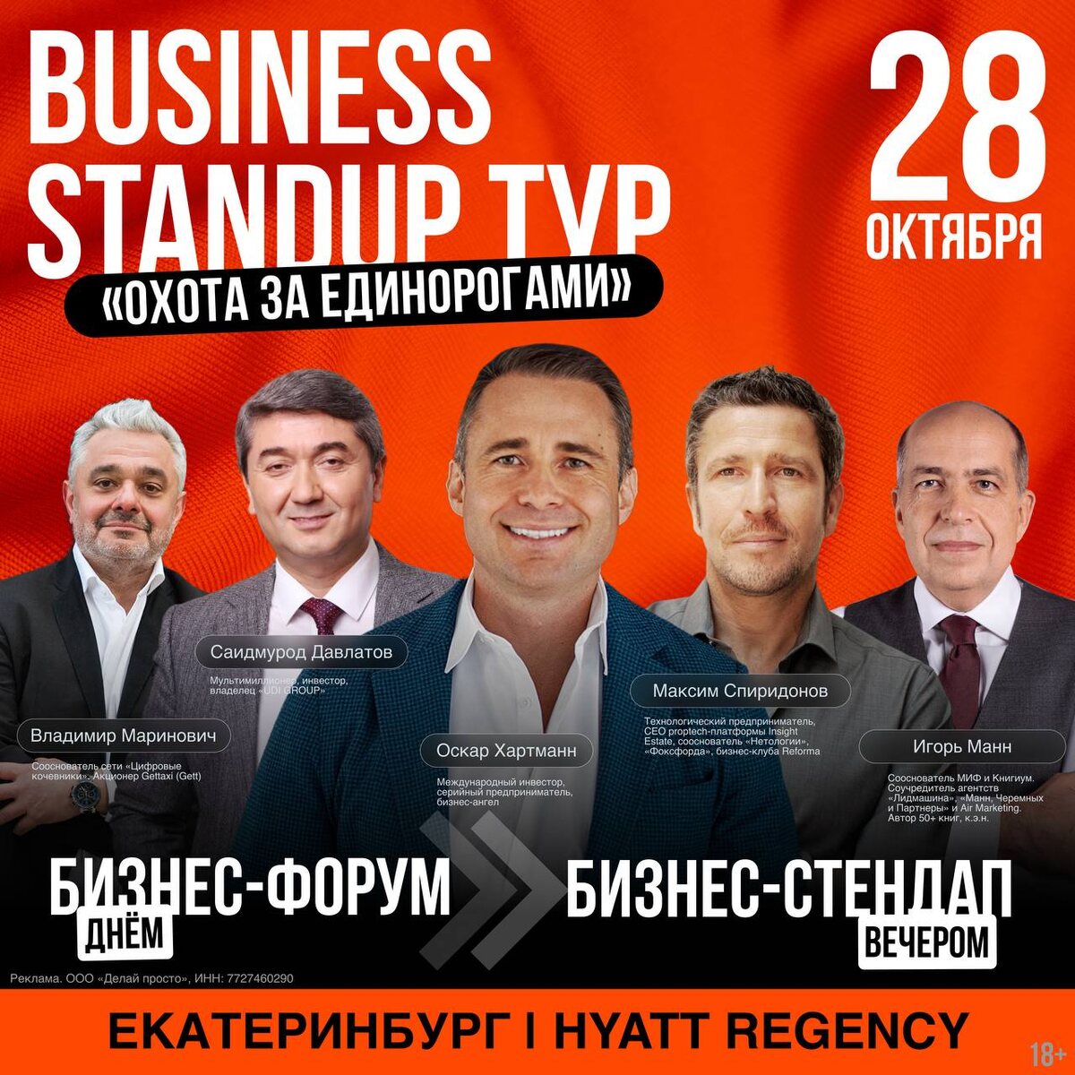 28 октября в Екатеринбург приезжает Оскар Хартманн! 📌 В HYATT REGENCY состоится Business Standup тур — уникальный формат, где честный разговор о бизнесе соединяется с практическими инструментами роста. Этот день будет полезен тем, кто: → застрял в операционке и работает больше своей команды; → хочет масштабироваться, но не понимает, где взять капитал и как правильно его использовать; → видит, что конкуренты обгоняют, но не знает, какие шаги сделать первыми; → живёт в режиме «пожарного», закрывая дыры вместо того, чтобы строить стратегию. В программе: ◾️ Нетворкинг с 600+ предпринимателями и управленцами; ◾️ Разборы компаний с выручкой от 100 млн рублей; ◾️ Практические инструменты привлечения инвестиций на сумму 10–100 млн. Среди экспертов: Саидмурод Давлатов (UDI GROUP, «САМО»), Максим Спиридонов (Insight Estate,«Нетология», «Фоксфорд», Reforma), Игорь Манн (Маркетолог № 1 в России, сооснователь издательства «Манн, Иванов и Фербер»), Владимир Маринович (Сооснователь сети «Цифров