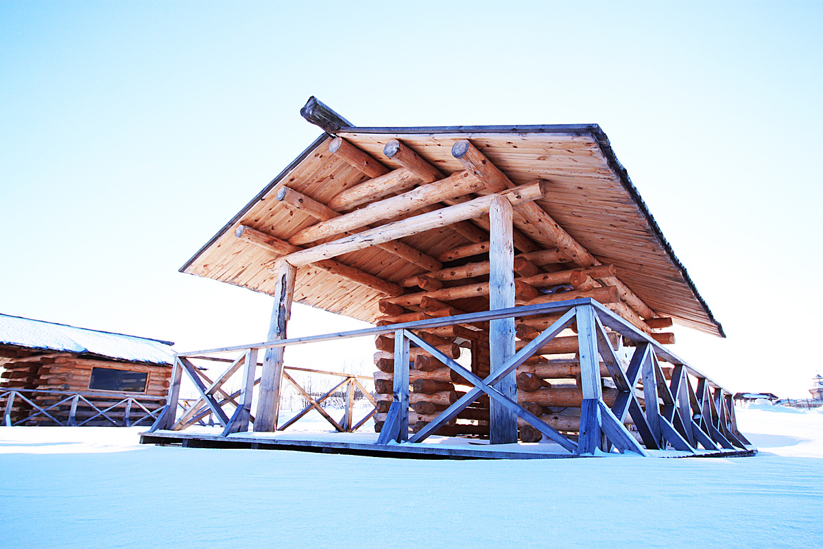 Конструкция выполнена в стиле деревянного зодчества с применением традиционной рубки «в реж», а тонированное остекление обеспечивает защиту от ветра. Лёгкая и открытая бревенчатая беседка сохраняет прозрачность пространства, не нарушая эстетику природного окружения.