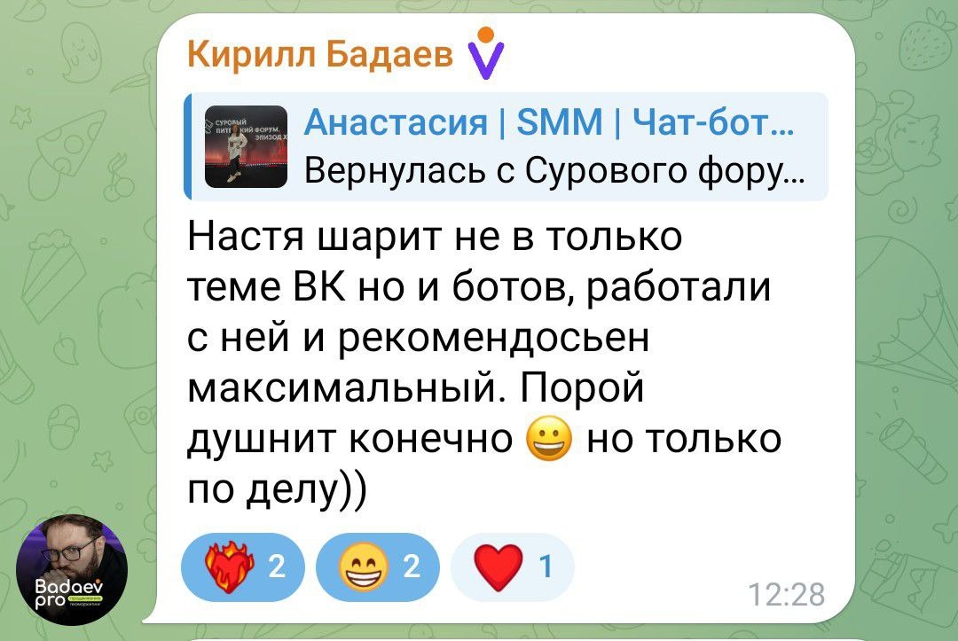 Обожаю когда меня рекомендуют 🥰 Да, я работаю не только с ВК и рекламой, я ещё собираю ботов разной степени сложности. От простого чат-бота выдачи подарка, до сложных с приемом оплат и прочими интеграциями. Самые частые чат-боты, которые любят мои заказчики: - выдача подарка за подписку на рассылку - сбор данных - автоответчик на частые вопросы - модератор чатов - вебинарная модель - клубная модель Если вам нужен чат-бот под задачи бизнеса, смело пишите мне! Я помогу составить путь вашего клиента и прописать ТЗ, соберу и протестирую бота! Мои клиенты во время настройки чат-бота и его ведения пользуются сервисом БотХатер бесплатно и безлимитно. 👨💻