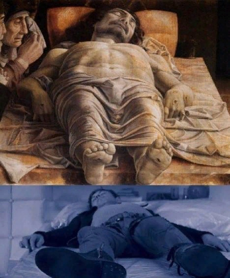Можно упомянуть и коленопреклонённого Криса Кельвина, поза которого указывает на «Возвращение блудного сына» Рембрандта, и Гибаряна, снятого камерой Вадима Юсова в заваленной перспективе, как на полотне «Мёртвый Христос» Андреа Мантеньи. Режиссёр не боялся экспериментировать с фактурой, когда выбирал Маргариту Терехову на роль матери по той причине, что лицо актрисы было «красивым и дегенеративным одновременно». Чтобы сделать добиться подобного эффекта, он просил оператора Георгия Рерберга снимать актрису в том же ракурсе, цвете и свете, в каких Леонардо да Винчи изобразил Джиневру де Бенчи. Примеры можно множить. Но Тарковский не расшаркивается перед классическими образцами, ― в «Зеркале», к примеру, он вступает в горячий спор с Бахом, создавая экранный образ «Страстей по Иоанну». Подобно немецкому композитору, разбившему Passion на речитативы (комментарии евангелиста) и хоры (поэтическое изображение сцен из жизни Спасителя), режиссёр повествует о бытии перед лицом смерти. Писатель Алексей ― Alter ego автора и рассказчик, существующий на экране лишь в виде голоса Иннокентия Смоктуновского и руки постановщика, подбрасывающего над кроватью опешившего чижа, ― умирает без каких-либо причин. Образ во многом навеян «Смертью Ивана Ильича» Льва Толстого. И всё, что видит зритель ― сумбур, творящийся в агонизирующем уме. Умирание ― процесс, на котором совесть ведёт опрос свидетелей. Прошлое столпилось у изголовья, ― эпизоды, вереницей проходящие перед мысленным взором литератора, укоряют того за проступки, и, чтобы оправдаться, Алексей вызывает из памяти персонажей, которым сам он готов выставить счёт. Тяжбе этой, казалось, не будет конца. Излюбленный приём мастера ― сопоставление в кадре верха и низа, священного и профанного. Вспомним эпизод грабежа и сожжения ордынцами Успенского Собора во Владимире из «Страстей по Андрею» («Андрей Рублёв», 1966 год). Сцена снята одним куском. На заднем плане татары, соорудив таран, «прободают» ворота, за которыми, вскинув долу глаза, православные на коленях бьют поклоны перед иконостасом. Оператор Вадим Юсов отъезжает аппаратом от ворот с осадным орудием и перебрасывает фокус на передний план, чтобы показать крытую соломой избу, на крыше которой в предсмертных муках скорчился мужик, ― его проткнул копьём ордынец. В одном этом кадре режиссёр соединяет в трагическом хронотопе цивилизацию и варварство, монотеизм и политеизм, Макрокосм и Микрокосм, Мир Горний и Мир Дольний.