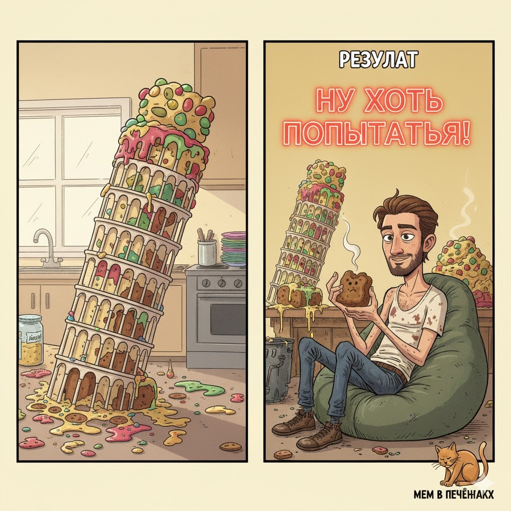 МЕМ В ПЕЧЁНКАХ. НУ ХОТЬ ПОПЫТАЛСЯ: Ода безнадёжным усилиям Диагноз: МИССИЯ ПРОВАЛЕНА, НО ОПЫТ ЕСТЬ! Привет всем, чьи старания не привели к успеху, но зато дали повод для шутки! Сегодня наш мем-герой — это фраза, которая стала нашим коллективным вердиктом, утешением и сарказмом над заведомо провальными затеями: "НУ ХОТЬ ПОПЫТАЛСЯ" Этот мем — не про успех, это про принятие поражения с достоинством! Почему он так прочно засел в печёнках? Потому что он позволяет нам с юмором принять тот факт, что иногда наши усилия абсолютно тщетны, но сам факт попытки уже заслуживает мема. Готовы похвалить себя за старания? Погнали! Хроника Апокалипсиса Как "ХОТЬ ПОПЫТАЛСЯ" стало утешением для всех Мем родился из бесконечного числа ситуаций, когда что-то задумывалось гениально, а получилось... как всегда. Он идеально подходит для ситуаций, где видна огромная разница между амбициями и результатом. Ключевой момент — это контраст между начальным энтузиазмом (Я сейчас сделаю шедевр!) и итоговым бардаком (Лад