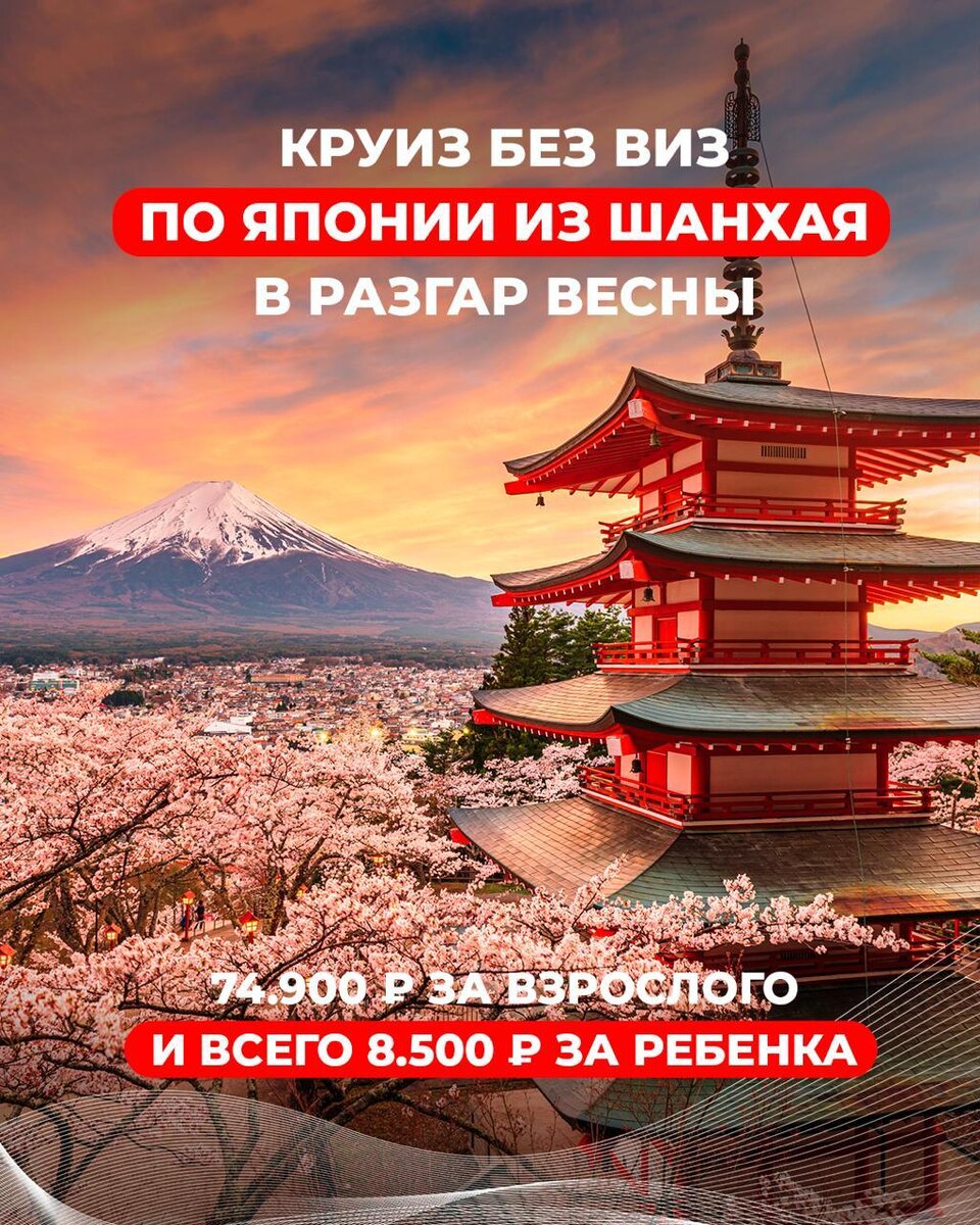 🤩🤩🤩🤩🤩⬇️ Находка этой недели❗️ выгодный рейс, где за ребенка вы заплатите только 105 долларов портовых сборов, а все остальное — бесплатно! ◾️Даты: 26 апреля - 1 мая 2026 ◾️Маршрут: Шанхай (Китай) – День в море – Фукуока (Япония) – Кумамото (Япония) – День в море – Шанхай (Китай) ◾️Лайнер: Spectrum of the seas, бары, рестораны, бассейны, шоу и дискотеки, аквапарк, скалодром, детские клубы по возрастам ◾️Цены за взрослых: от 74.900 ₽/чел — каюта с окном от 88.540 ₽/чел — каюта с балконом Сюда включено: проживание в каюте, питание, бассейны, джакузи, развлечения на борту, портовые и сервисные сборы ✈️ а/б Москва — Шанхай — Москва под даты круиза — от 45.500 ₽/чел 🔘можно застать цветени сакуры (+ цветущую глицинию) 🔘Кумамото — родина забавных игрушечных медвежат Кумамонов, они тут везде: на вывесках, фонарях, автобусах и даже на столбиках. Дети точно оценят! 🔘в Фукуоке большой зоопарк с белыми носорогами, красными пандами, бегемотами и жирафами и удивительный интерактивны