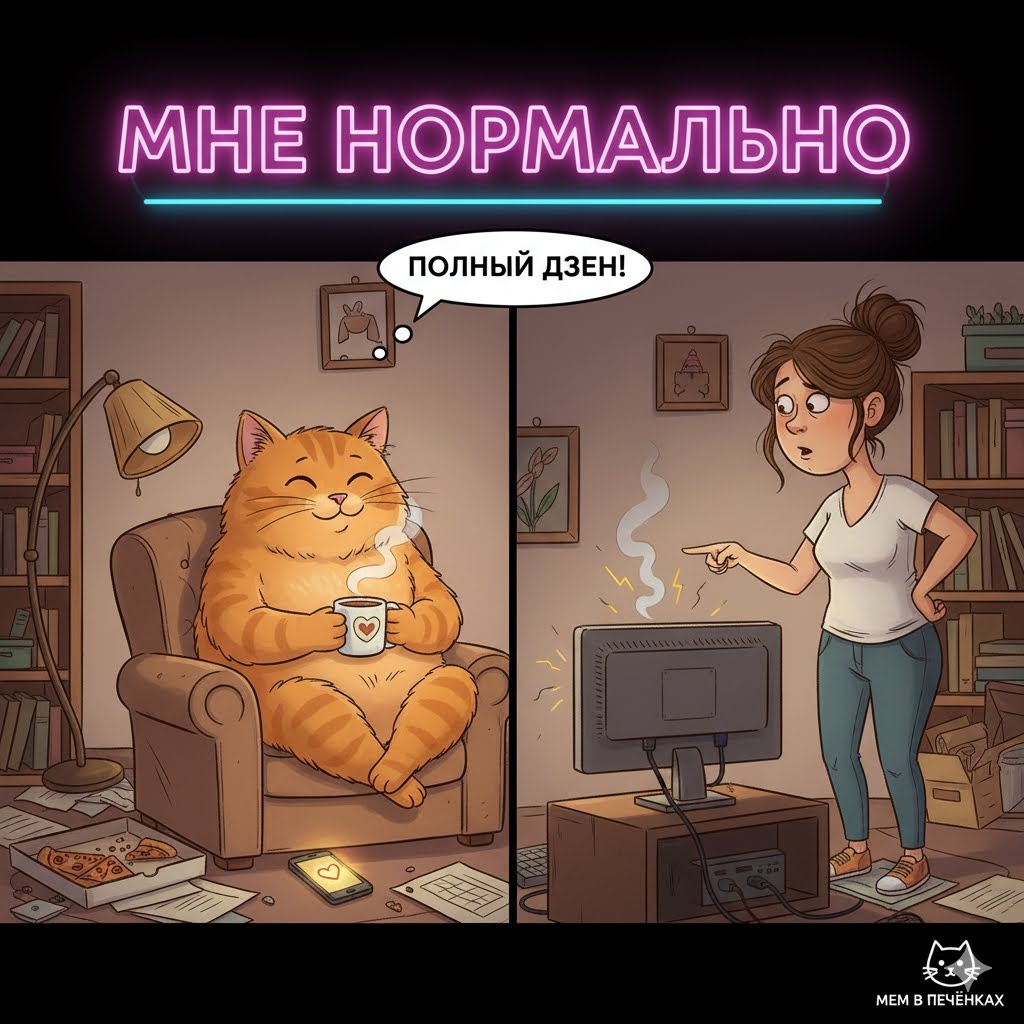 МЕМ В ПЕЧЁНКАХ. МНЕ НОРМАЛЬНО: Философия счастливого принятия Диагноз: ПРИНЯТИЕ! Привет всем, у кого всё хорошо, даже если на самом деле не очень! Сегодня наш мем-герой — это фраза, которая стала нашим коллективным ответом на тревогу, стресс и чужие попытки нас пожалеть: "МНЕ НОРМАЛЬНО" Этот мем — не про ложь, это про выбор! Почему он так прочно засел в печёнках? Потому что он позволяет нам с юмором принять тот факт, что мы сами решаем, как нам себя чувствовать, несмотря на объективные трудности. Готовы объявить себя счастливым? Погнали! Хроника Апокалипсиса Как "МНЕ НОРМАЛЬНО" стало нашим щитом от жалости Мем родился из бесконечного числа ситуаций, когда что-то идет не по плану, но мы решаем не париться. Нас спрашивают: "Ты точно в порядке?", а мы отвечаем с невозмутимым видом: "Мне нормально". Ключевой момент — это контраст между объективной бедой (Бардак, дедлайн, сломанный стул) и субъективным ощущением счастья (Но я пью чай!). Мы используем этот мем, когда: * Хотим отмахнуться о