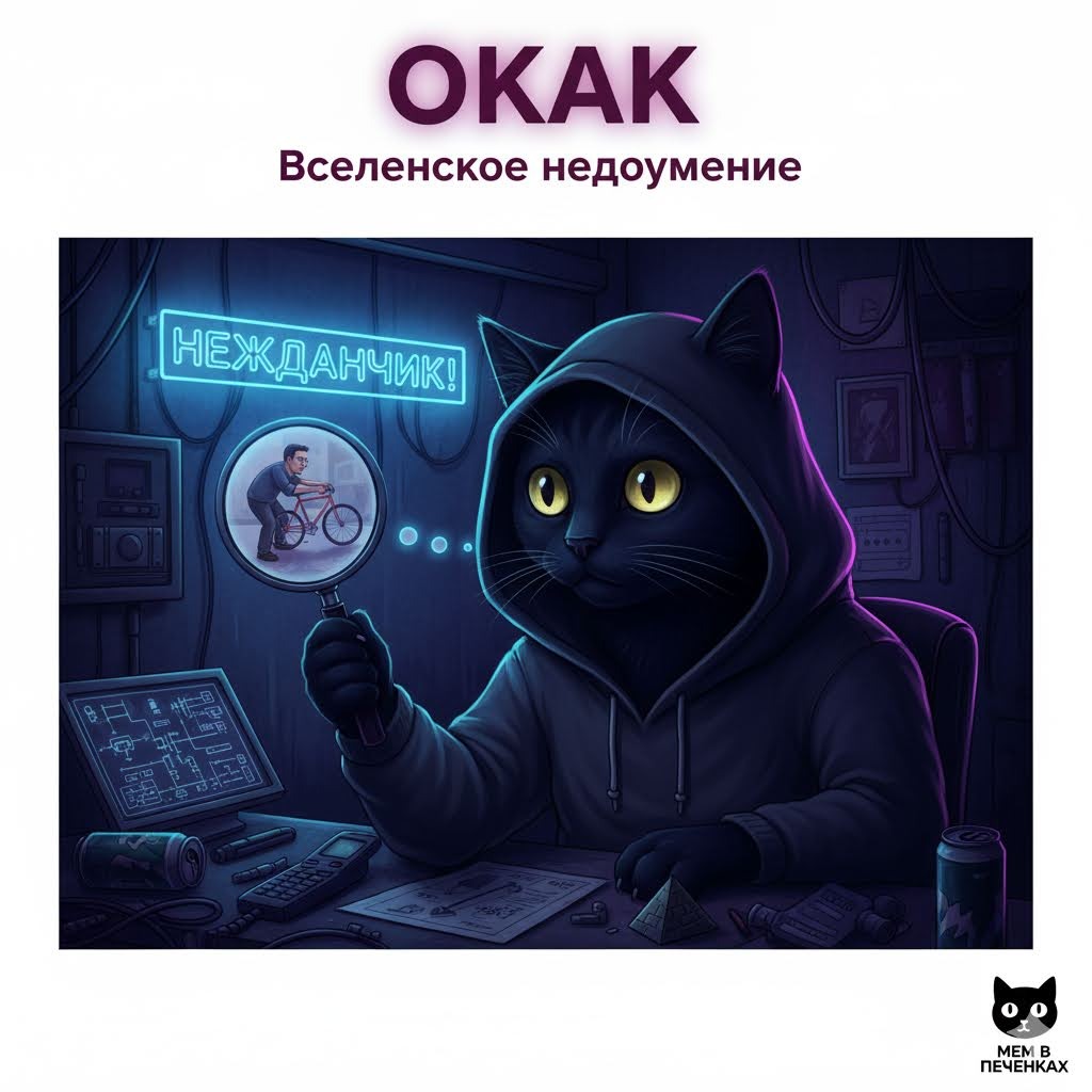 МЕМ В ПЕЧЁНКАХ. ОКАК: Вселенское недоумение Диагноз: НЕЖДАНЧИК! Привет всем, кто любит, когда простое слово вдруг обретает философский смысл! Сегодня наш мем-герой — это не слово, а состояние души, выраженное мордой кота в капюшоне: "ОКАК" Этот мем — не про кота, это про внезапное осознание! Почему он так прочно засел в печёнках? Потому что он позволяет нам с юмором принять тот факт, что мы часто замечаем очевидные или странные вещи только спустя долгое время. Готовы увидеть мир по-новому? Погнали! Хроника Апокалипсиса Как слияние кота и слова создало новую реальность Мем "Окак" (иногда пишется "О как") стал вирусным в 2025 году. Он возник из объединения: * Картинки: Стильный и слегка мрачный черный кот в капюшоне или худи (часто нейросетевого происхождения). * Слова: Междометия "Окак", которое раньше означало что-то вроде устаревшего "эвона как!" — выражение удивления, осознания или иронии. В итоге, мем стал универсальной реакцией на мелкие, но важные осознания, неожиданные ответ