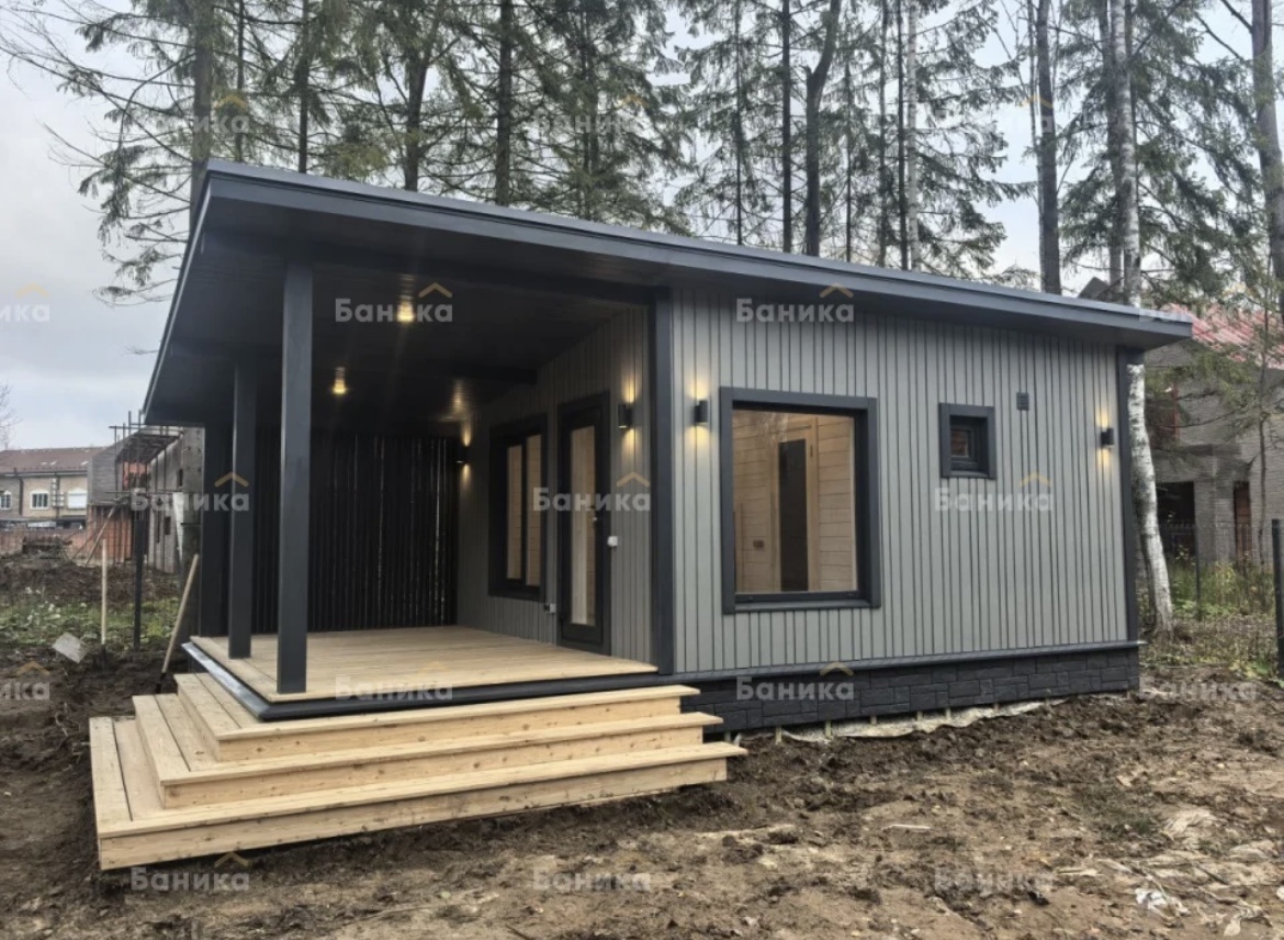 На фото: современная баня с террасой. Размер: 4,5х6,5м.