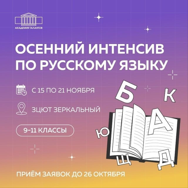 🚀 Приготовьтесь к захватывающему путешествию в мир русского языка! 🗓 С 15 по 21 ноября ЗЦЮТ «Зеркальный» станет местом силы для старшеклассников, мечтающих покорить ВсОШ! ✅ В программе интенсива: - Русский язык в историческом аспекте — фонетика и орфография как результат исторического развития русского языка - Основы фонетики и фонологии — артикуляторный, акустический и перцептивный аспекты; понятие буквы и звука - Лексикология — слово как единица лексики, его смысловые и стилистические оттенки - Грамматика русского языка — морфология: части речи, морфологические категории, слово и его грамматические значения; словообразование и формообразование - Интенсивное решение олимпиадных задач и практические тренировки 🔥 Это будет не просто интенсив — это приключение, которое изменит твой взгляд на русский язык и даст мощный старт на пути к ВсОШ! 📌 Регистрация по ссылке clck.ru/3PpWRv Подробности: https://vk.com/wall-182908042_15482 #школы, #физмат, #олимпиады, #подготовкакэкзаменам