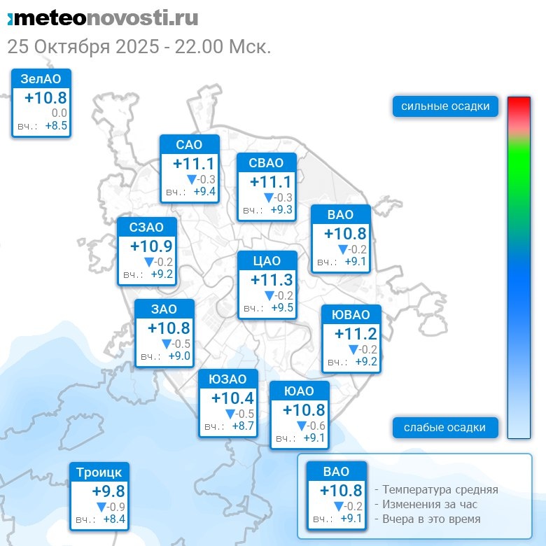 В 22:00 в Москве было от +9.9°C до +11.5°C, средняя температура +11°C #погода #Москва #осень #температура #25октября #суббота