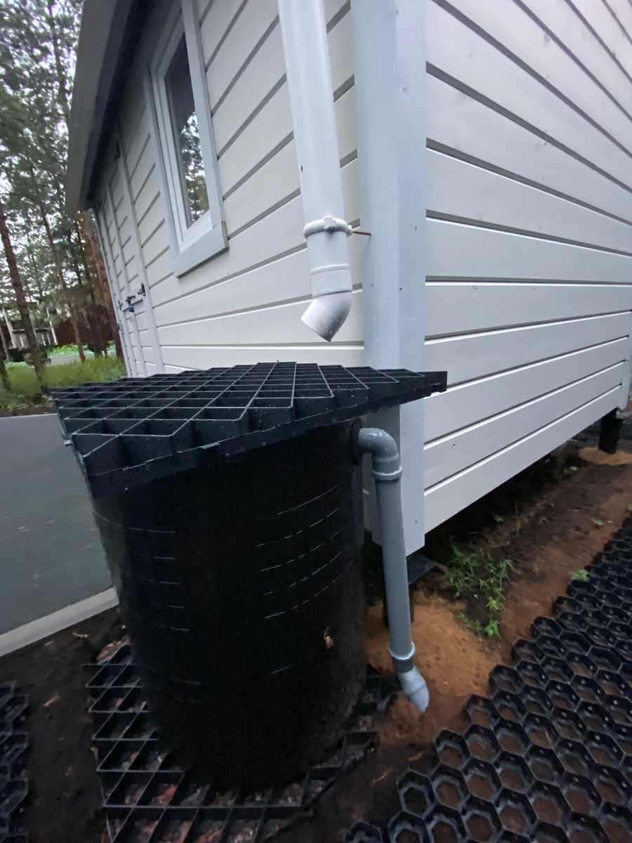 Каждый год мы сталкивались с одной и той же проблемой: бочку для сбора дождевой воды приходилось убирать раньше, чем заканчивался сезон дождей. И куда текла потом дождевая вода? Правильно - под дом, размывая песок вокруг свай и забрызгивая всё вокруг. А если убирать бочку позже, когда уже первый снежок пойдёт, то можно пропустить важный момент, и вода в ней превратится в лёд. Такой печальный опыт мы уже имели, я о нём рассказывала. В тёплое время года наша водосточная система выглядит вот так: Вода собирается в бочку, излишки отводятся через отверстие и трубу небольшого диаметра. Устройство такой системы я тоже описывала. Когда бочка убирается на зиму, получается вот так: Дождевая вода в этом случае хлещет сверху под большим напором (если ливень), а ранней весной, когда оттепели, ещё и замерзает вокруг сваи. Поэтому я долгое время думала, как решить эту проблему. Почитала-посмотрела, стала искать разные приспособления. Маркетплейсы предлагали какие-то полиэтиленовые "рукава", страшные